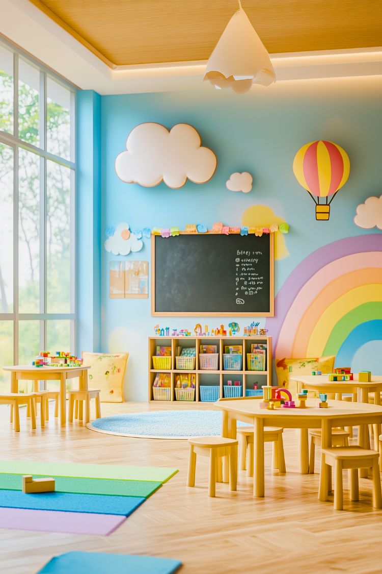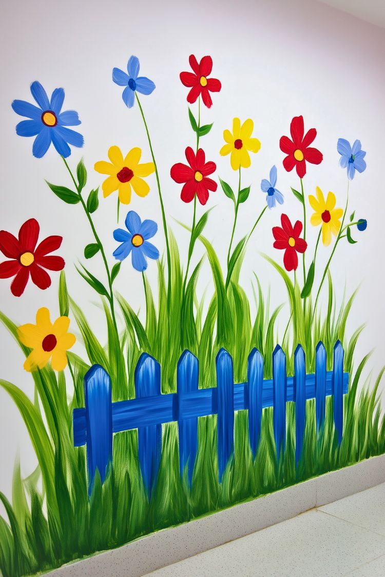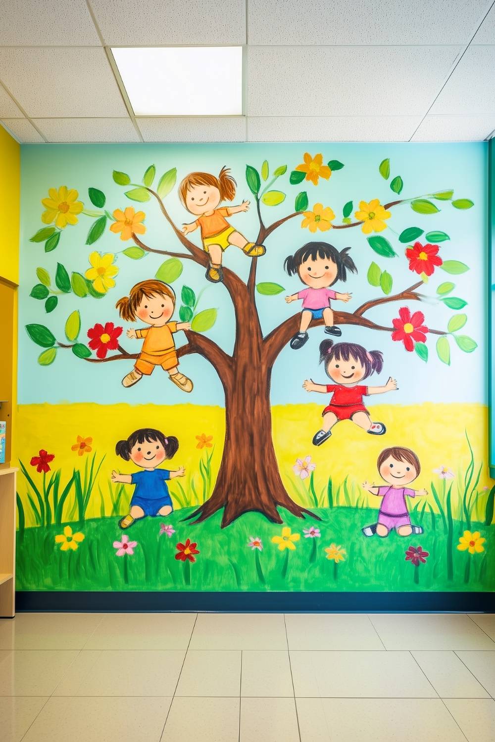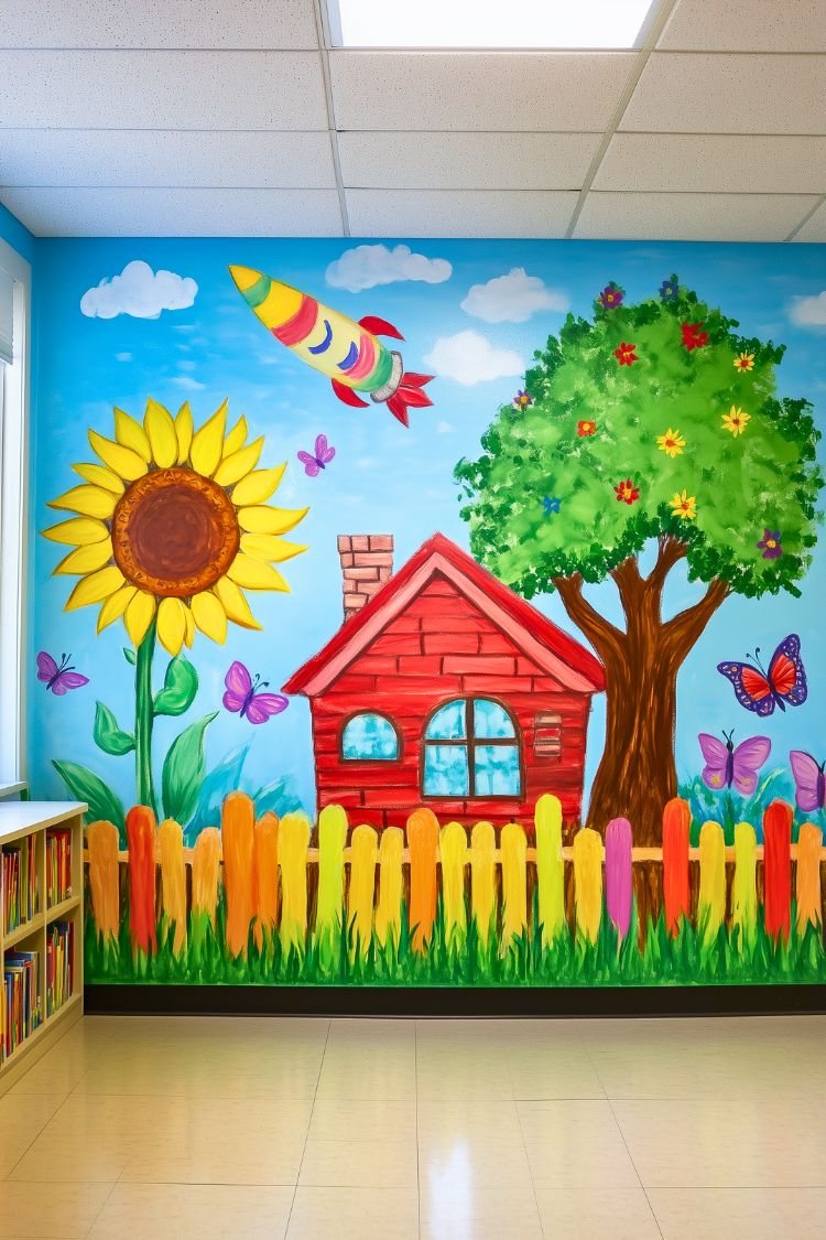 We’ve come so far with the last idea already, and have you got any ideas yet? For me, this mural makes me feel like childhood joy captured on a wall. The bright blue sky, colorful flowers, and happy kids playing in the trees create such a heartwarming scene. I bet the kids will really like seeing this one in their classroom this spring.