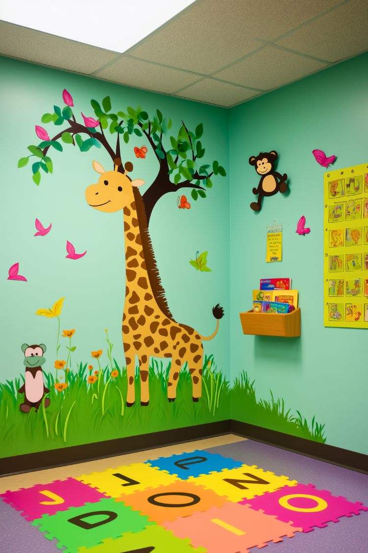 I have to say this classroom wall is such a sweet mix of learning and play for the little toddlers. The smiling giraffe peeking through painted leaves instantly brightens the space, and the alphabet mat seems to tie it all together.