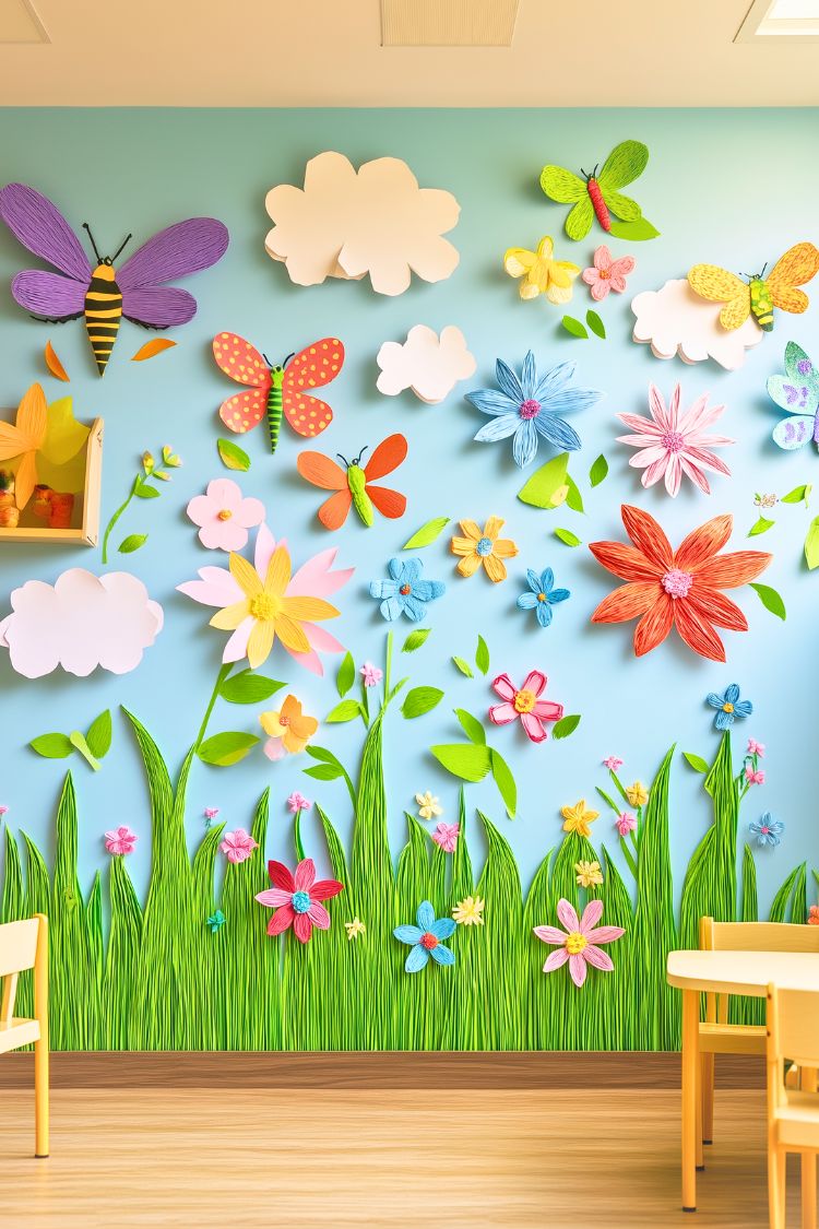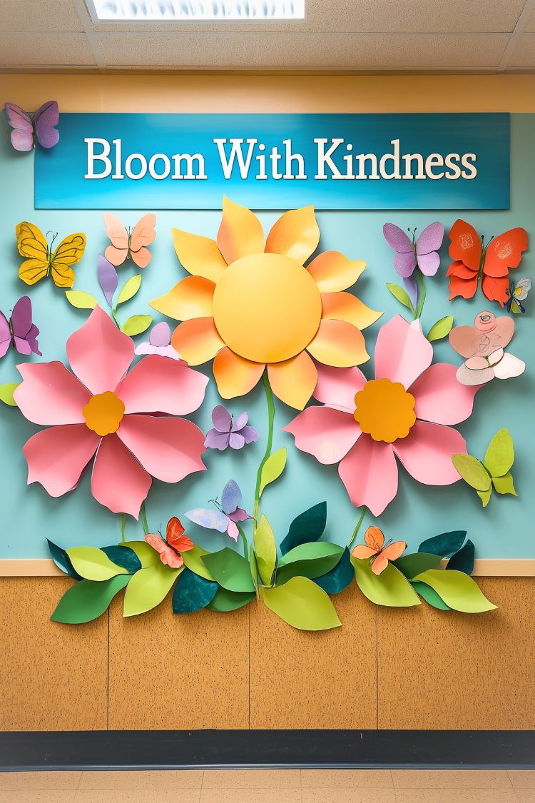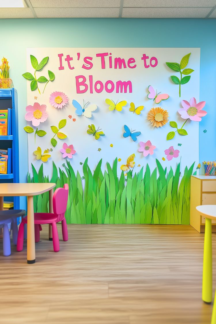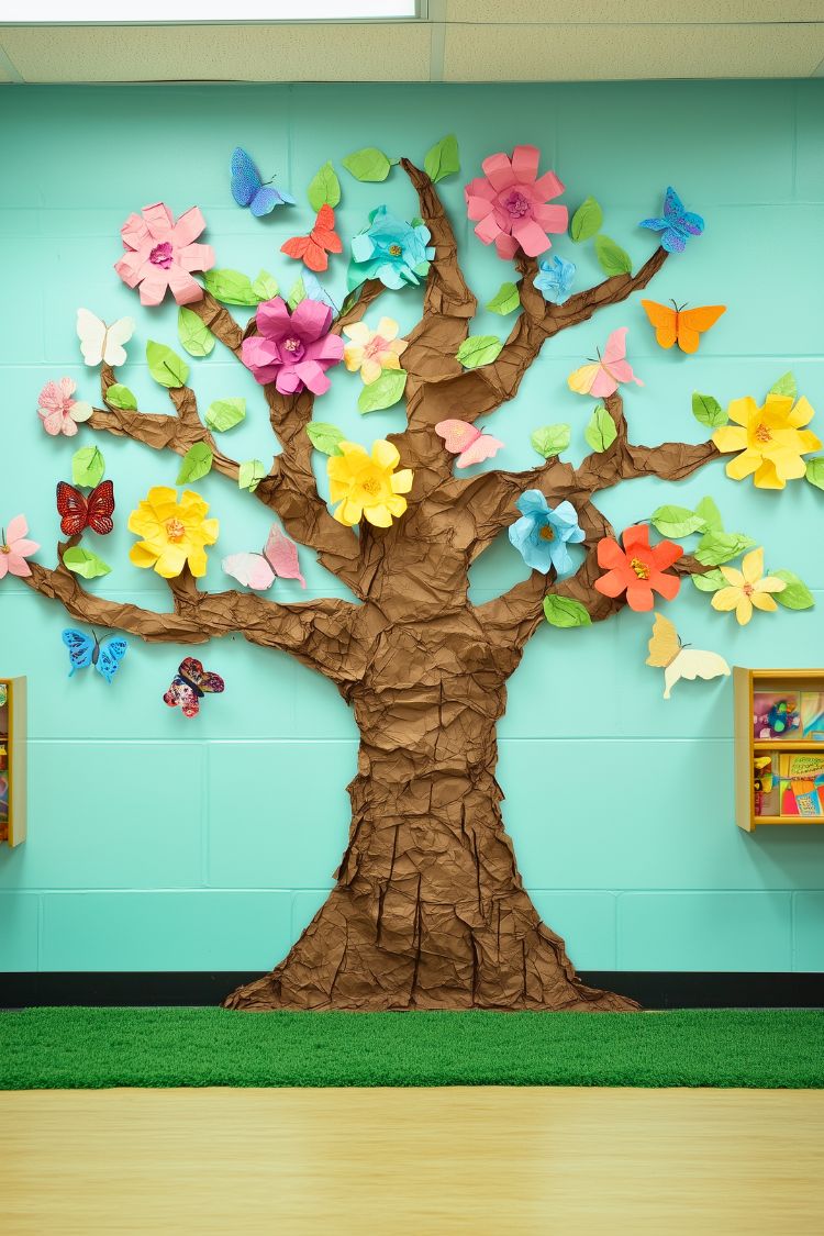 This decoration might be one of the most uplifting classroom designs I’ve seen. The paper flowers and butterflies almost seem to flutter off the wall, filling the room with warmth and color. Even the paper grass appears to have its mission in brightening up the room. I can tell this wall was made with love, and it truly captures the joy of spring in the classroom for kids.