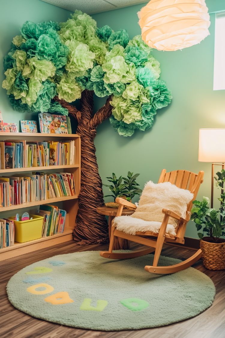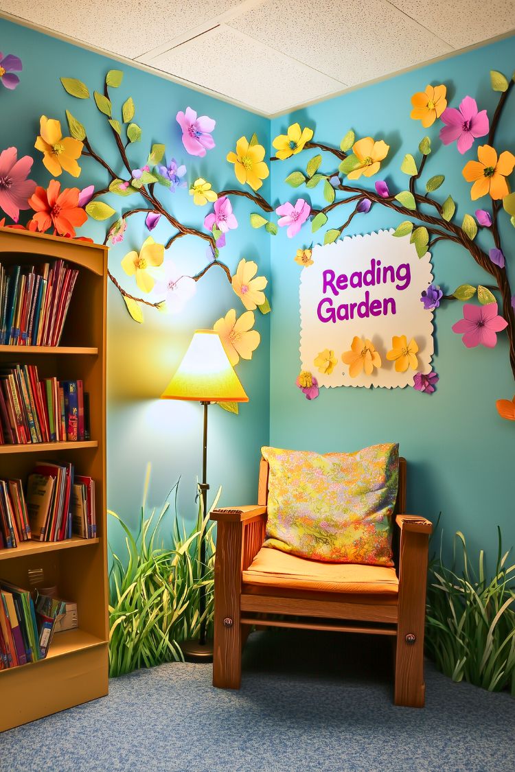 Creating a reading garden corner is also such a sweet way to make your students interested. The paper flowers and branches stretch across the walls, turning the space into a blooming hideaway for young readers. A single cozy lamp and a big chair for teachers sitting and telling stories are great too.