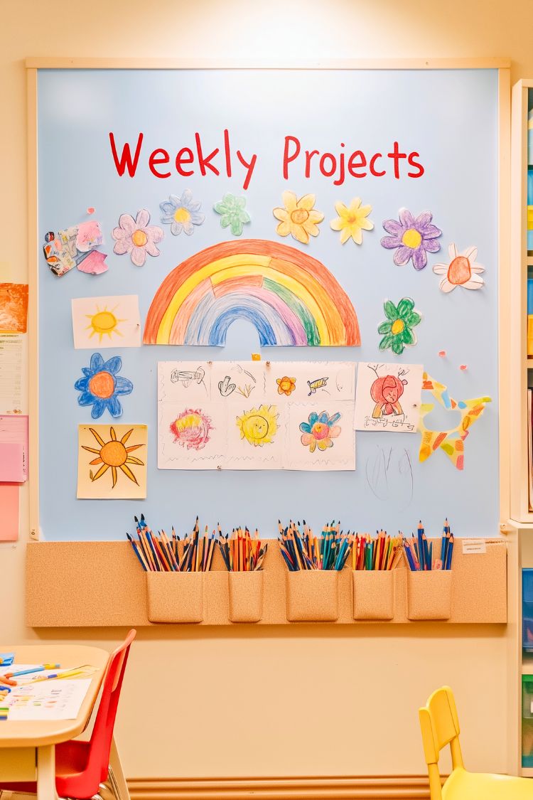 If you’re looking for ideas to transform the walls in your classroom, the idea in this snapshot will be a perfect inspiration. Why don’t you decorate with your children’s weekly art projects? That must be a really cool way to encourage them to do more, and also to tribute their works.