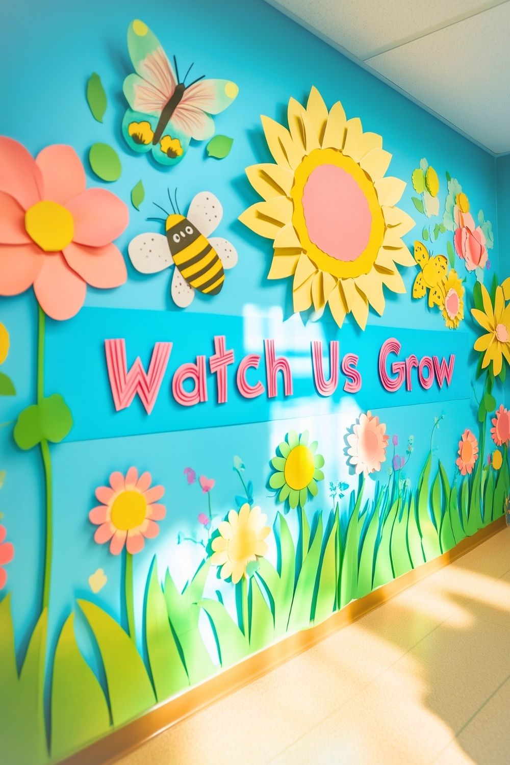 Starting with this spring kindergarten wall, I love how bright and cheerful it feels the moment you see it. The giant paper sunflower is definitely the highlight of the whole room. Other things like pastel blooms, and little bees and butterflies make a corner of the classroom come alive like a real garden. And the “Watch Us Grow” message couldn’t be more perfect for this spring season.