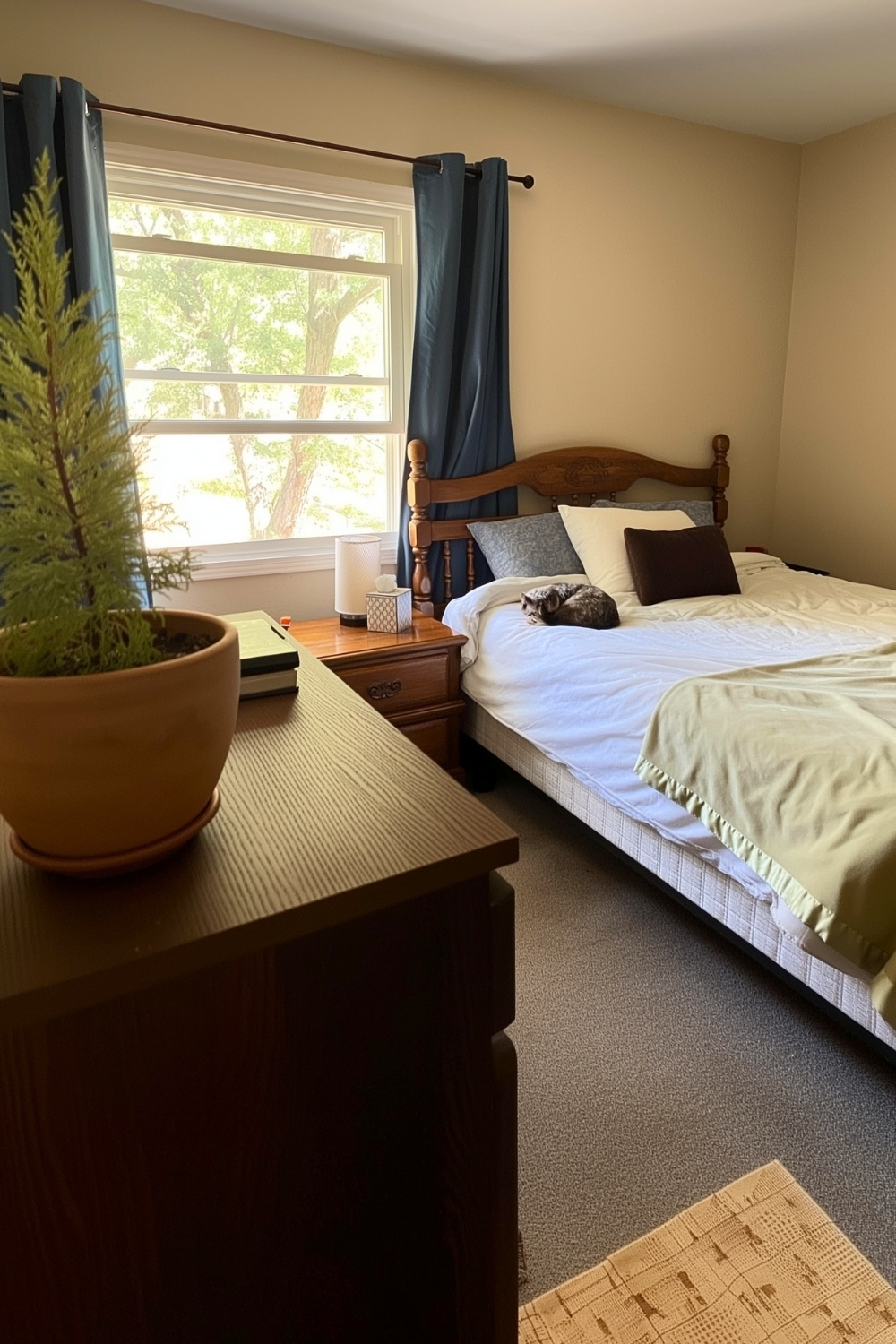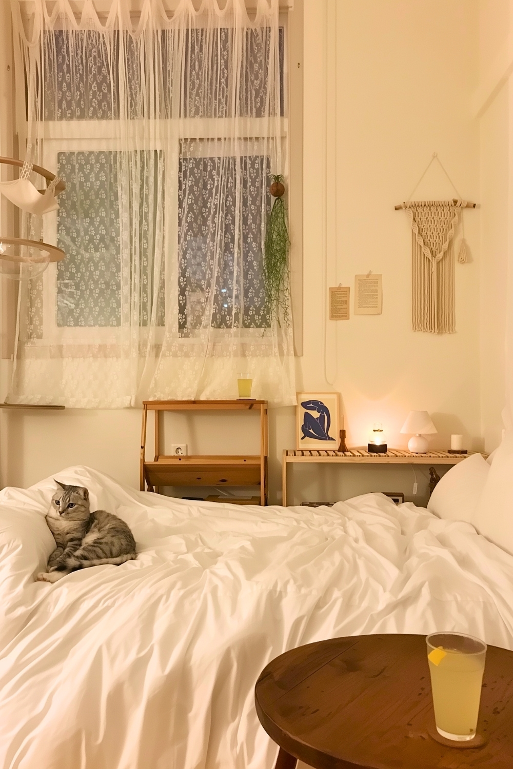 Finally, u/Sigghun’s room shows how soft white bedding, warm lighting, and simple wood pieces can turn a small bedroom into a bright, restful space. The little grey cat brings that instant hygge feeling, and the small blue artwork adds just enough color without overwhelming the room. You can see clearly how a tiny condo bedroom can feel peaceful and warm simply by choosing the right textiles, lighting, and tones.