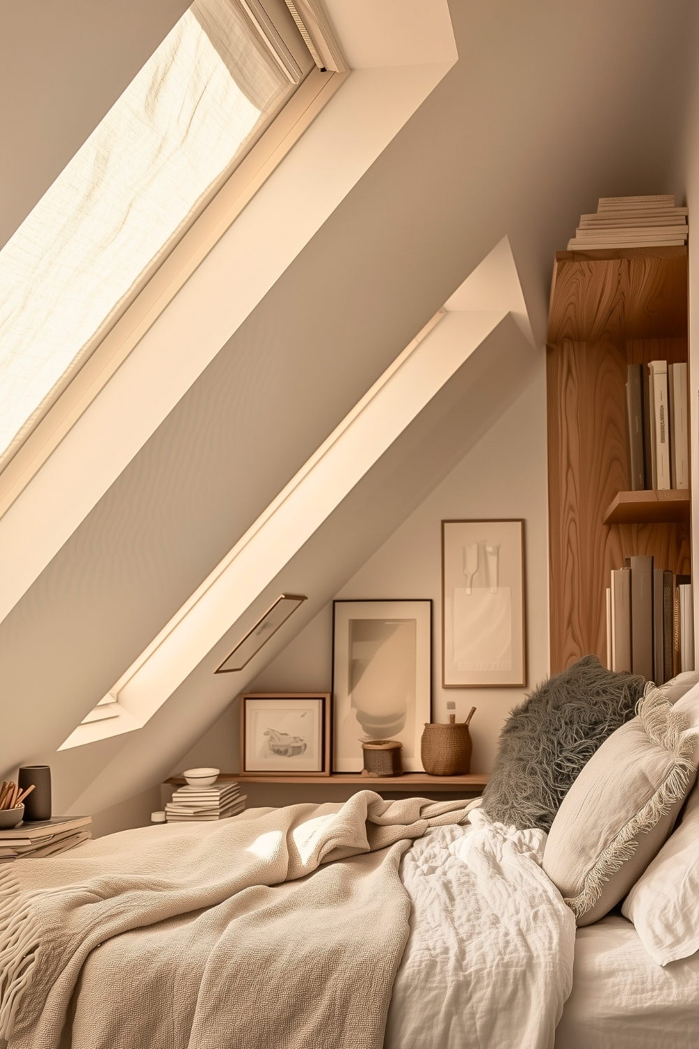 There’s another tiny chic attic bedroom I came across recently that carries the same peaceful energy, but in a slightly more Scandinavian winter way. The sloped ceiling, the soft white curtains, and the pale neutral textiles create that gentle hygge glow that makes you want to crawl right under the blanket. I adore how the skylights brighten the whole nook without killing the cosy atmosphere – it feels like a cottage-style retreat carved right into the roof.