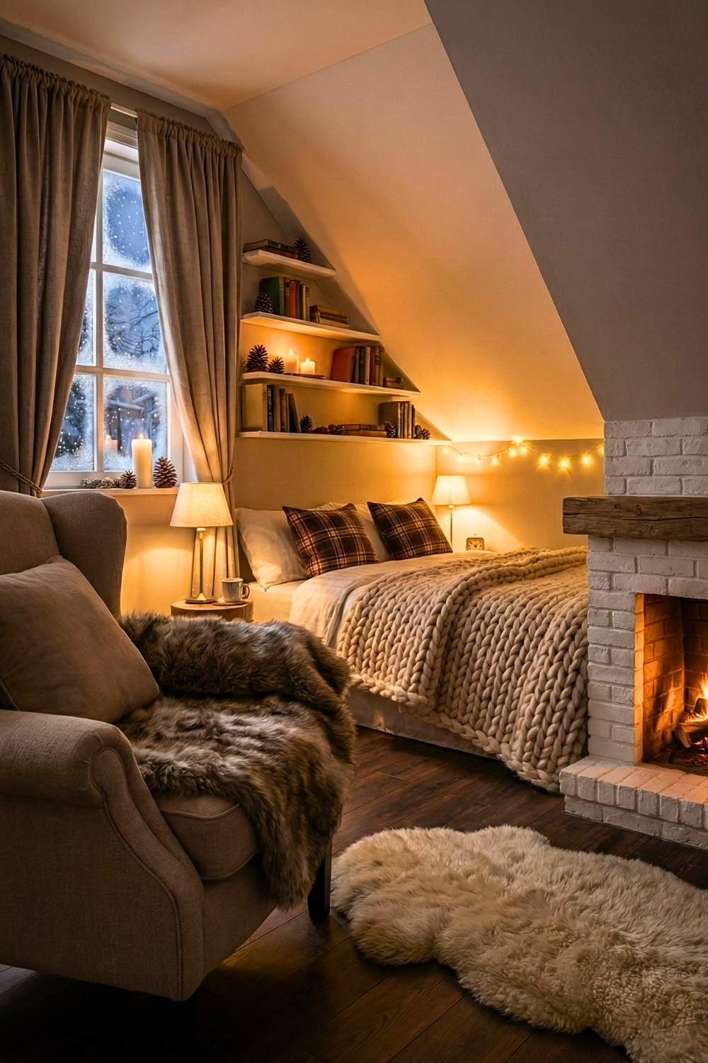 Attic bedrooms can feel tricky in winter, but this one turns sloped ceilings into an advantage rather than a limitation. Warm lighting, rustic wood, and layered brown textiles help the space feel like a snug cabin retreat instead of an awkward loft. I find this kind of setup especially comforting, as it naturally draws you toward the bed as the warmest, most relaxing spot.