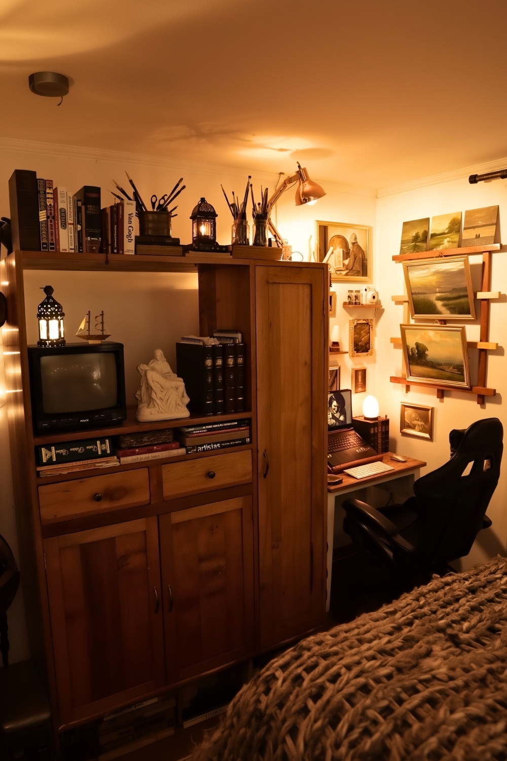 The books, tiny TV, and snug desk give the room a purpose – to relax, read, create, and unwind; a great example of how thoughtful lighting, artwork, and textures can make a compact layout feel more personal and warm.
