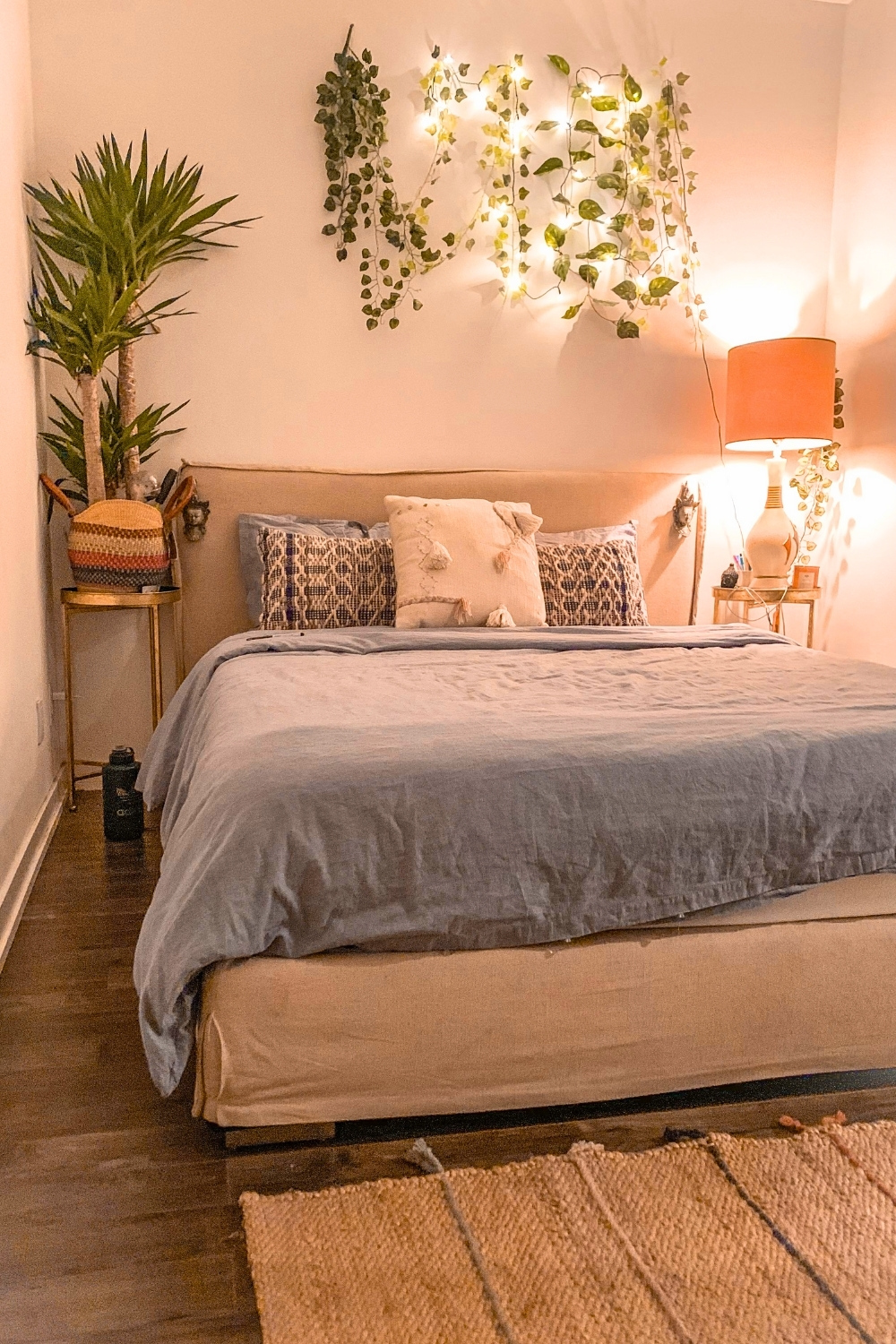I often recommend fairy lights for small farmhouse bedrooms, and this space shows exactly why they work so well. Running lights along the ceiling adds warmth without taking up valuable space, helping the room feel softer and more inviting at night. I really like how the neutral bedding keeps everything peaceful while still feeling deeply cozy.
