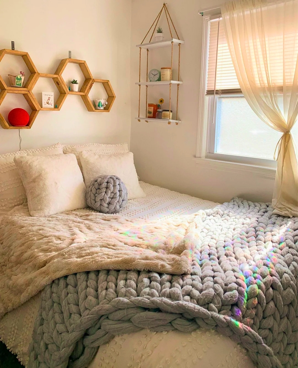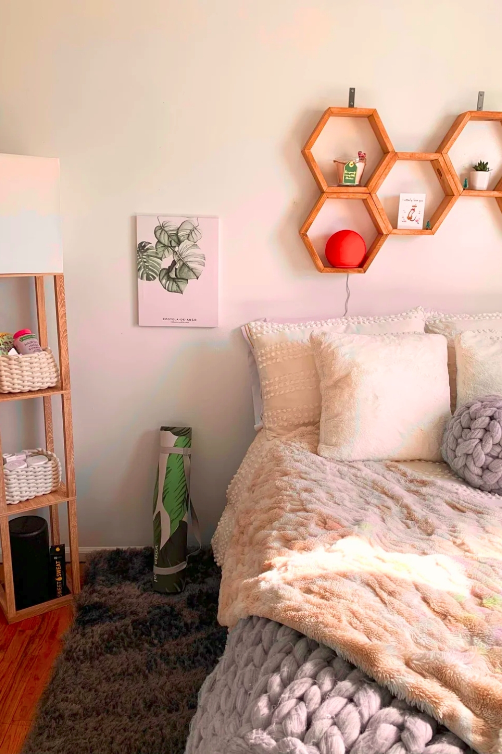 The honeycomb shelves and little decorative touches add personality without crowding the room, which is such a smart move in a small condo or apartment. It feels like a cozy, budget-friendly retreat for a young renter or student.