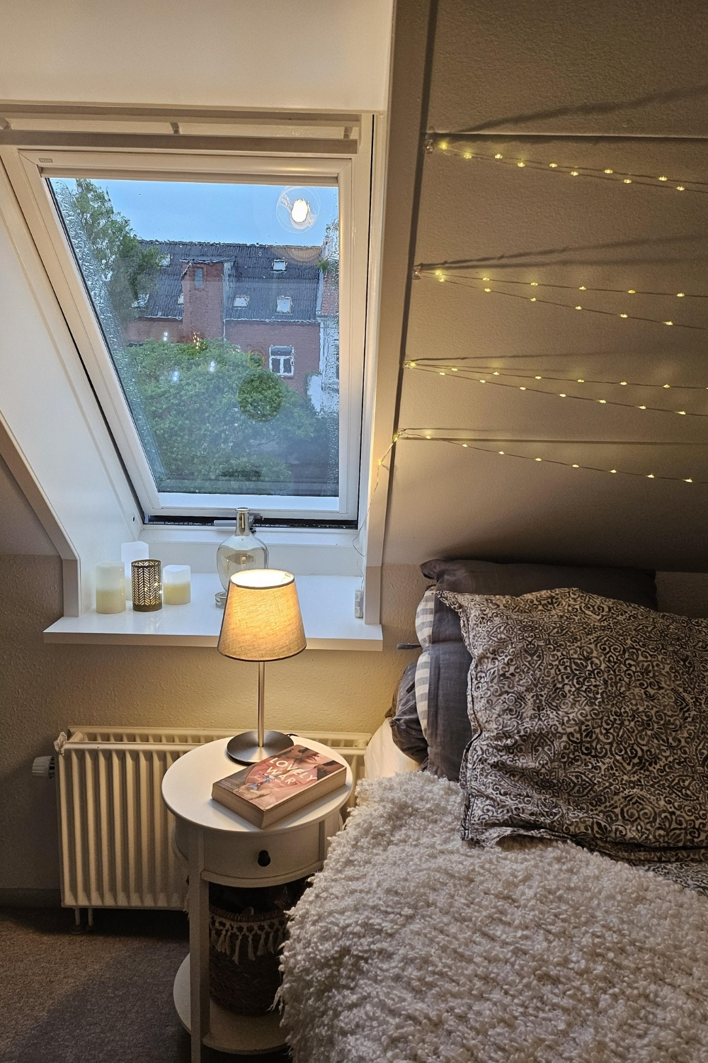 Then there’s this elegant attic room by u/Yourangmilady, which is exactly how I imagine a winter hygge hideaway. Soft fairy lights along the sloped ceiling, a fuzzy blanket, and a simple bedside lamp all work together to keep things warm yet clean. The skylight brings in peaceful daylight, and the candles on the ledge make the bed area feel extra comforting.
