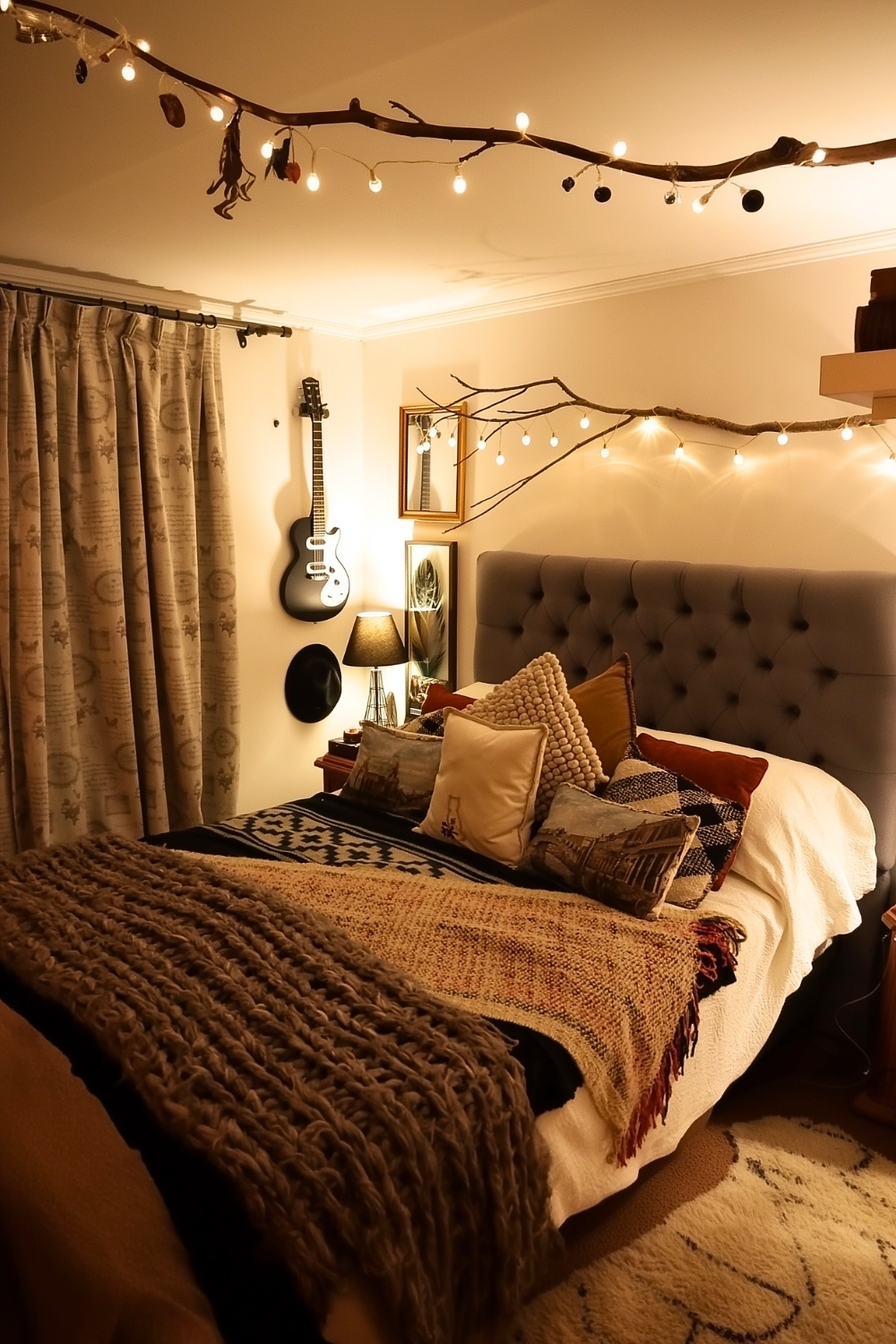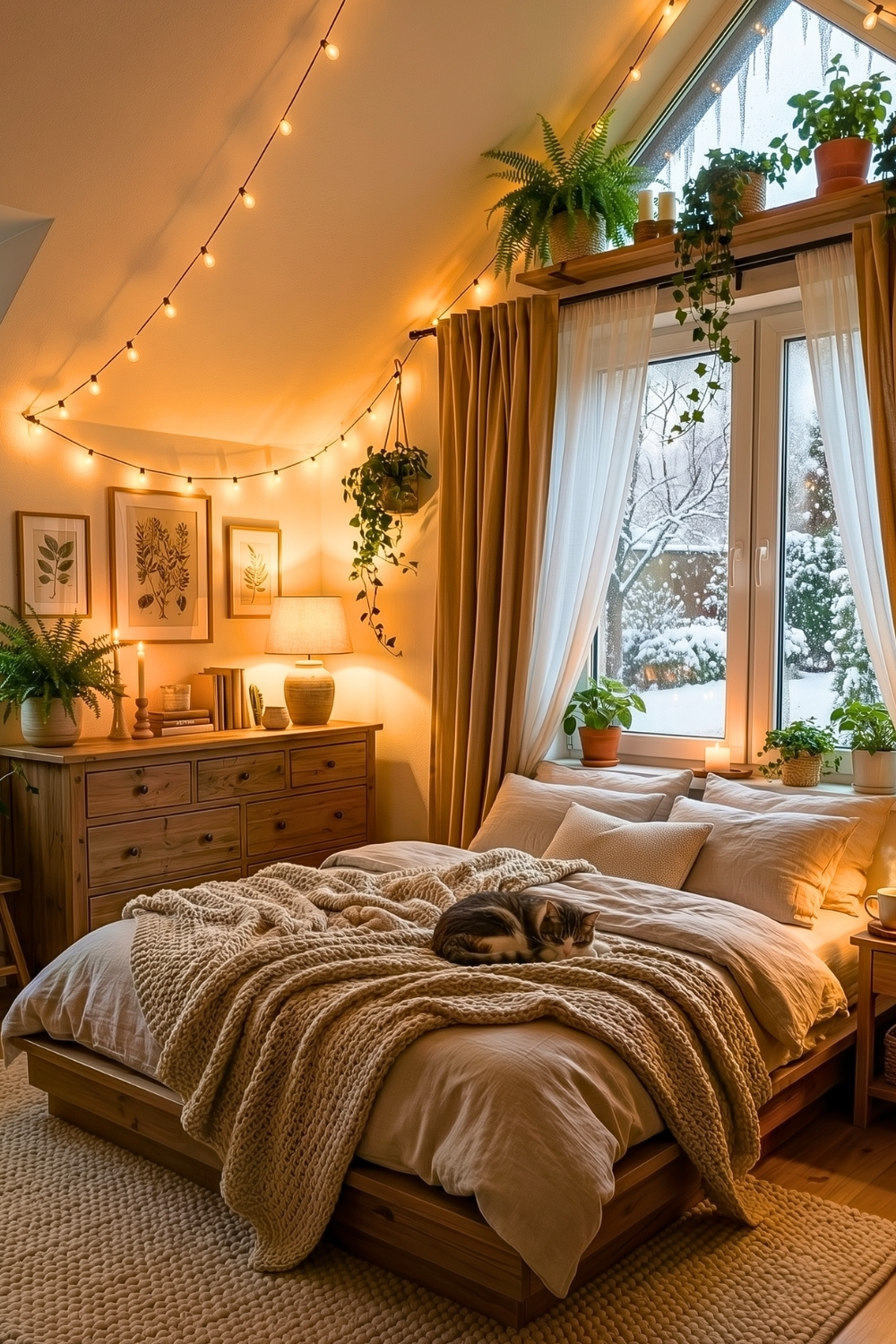 What immediately stands out in this small winter bedroom is how the layered textiles and warm lighting turn a simple layout into a deeply relaxing space. The chunky knit blanket, fuzzy rug, and gentle fairy lights are an easy way to make a tiny rental or condo feel warmer without changing the furniture. I love how the cozy chair tucked beside the bed makes it feel like a personal hygge corner rather than just a place to sleep.
