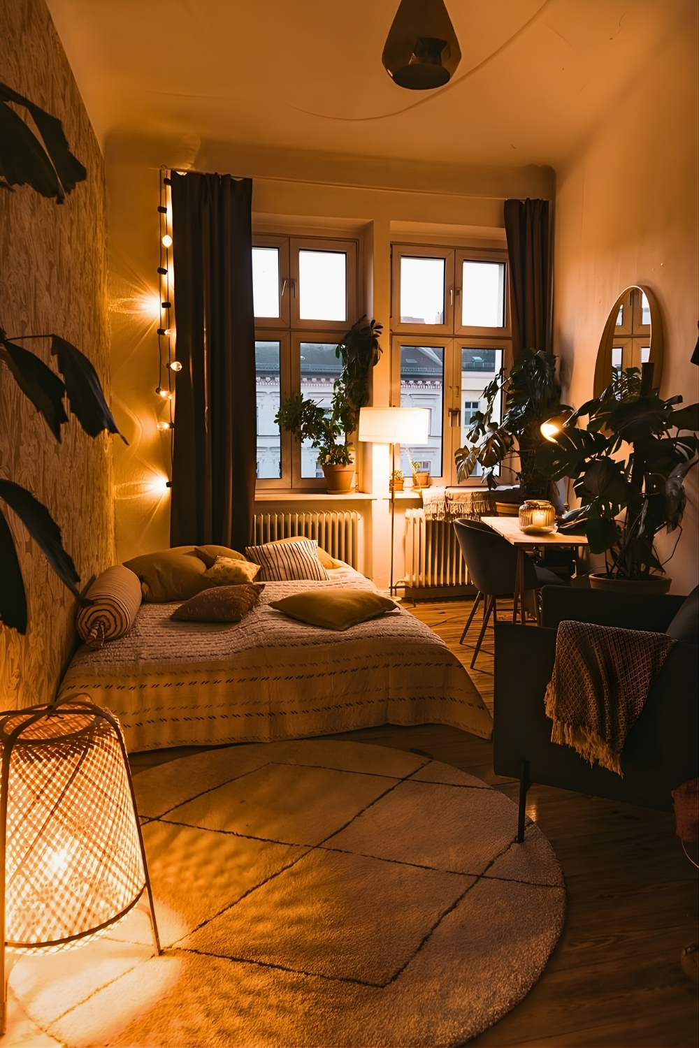I love how this low, frame-free bed instantly turns the whole studio apartment into a hygge-style nest – u/caspiy really nailed that calm, grounded feeling. The big round rug, the soft layering of lights, and all the greenery give the space a warm, relaxing atmosphere. And instead of harsh ceiling lighting you usually get in small rentals, the fairy lights and woven lamps make everything feel softer. It’s exactly the kind of minimalist setup I’d copy in a tiny home or student bedroom.