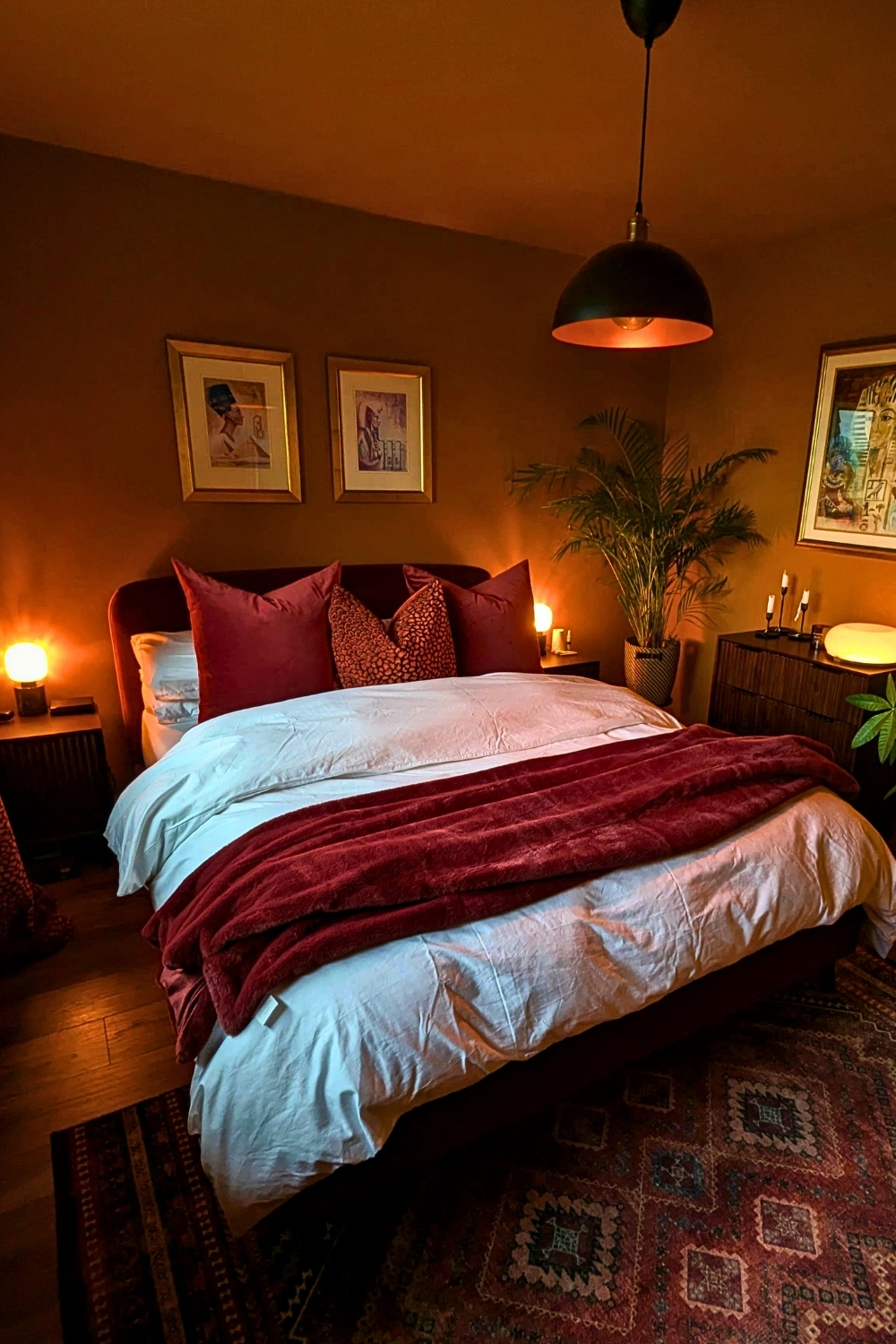 I’m completely drawn into this deep orange room by u/KatttEmilyP. The warm wall and ceiling color wraps around the bed in the most comforting way, and the vintage-style rug adds even more character. With the layered lighting and moody glow, it almost feels like a peaceful spa-hotel getaway. If you’ve been unsure about using bold color in your bedroom, this cozy, hygge, slightly Moroccan-inspired idea shows how to do it without losing calmness.