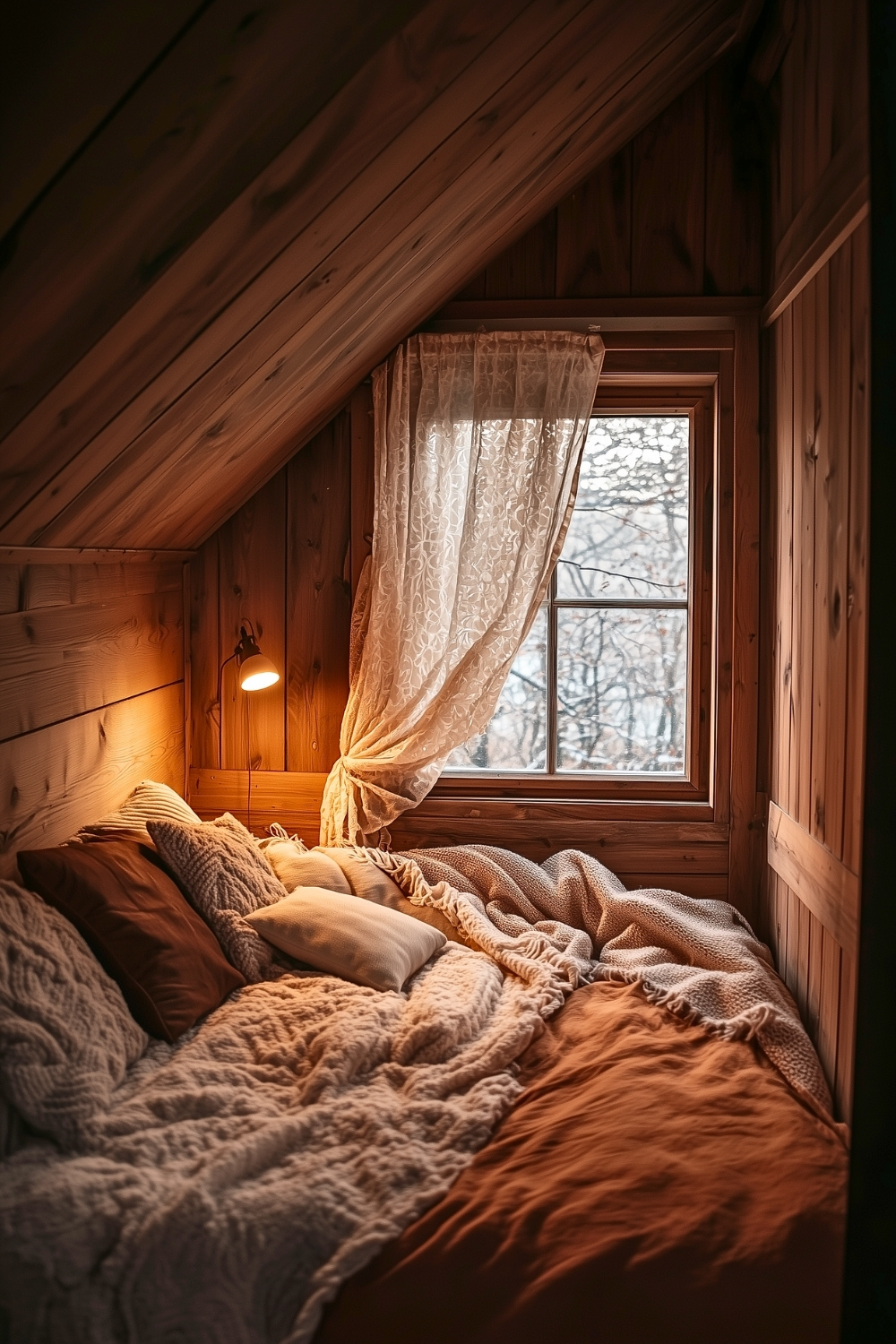 And then there’s the bedroom that feels almost like a cosy winter cabin – every inch wrapped in warm wood, from the walls to the sloped ceiling. The soft brown bedding and chunky knit blankets make the bed feel like the warmest spot in the house, especially with that single warm lamp glowing beside it. I love how the sheer curtain catches the daylight; it adds such a romantic, rustic softness to the room.