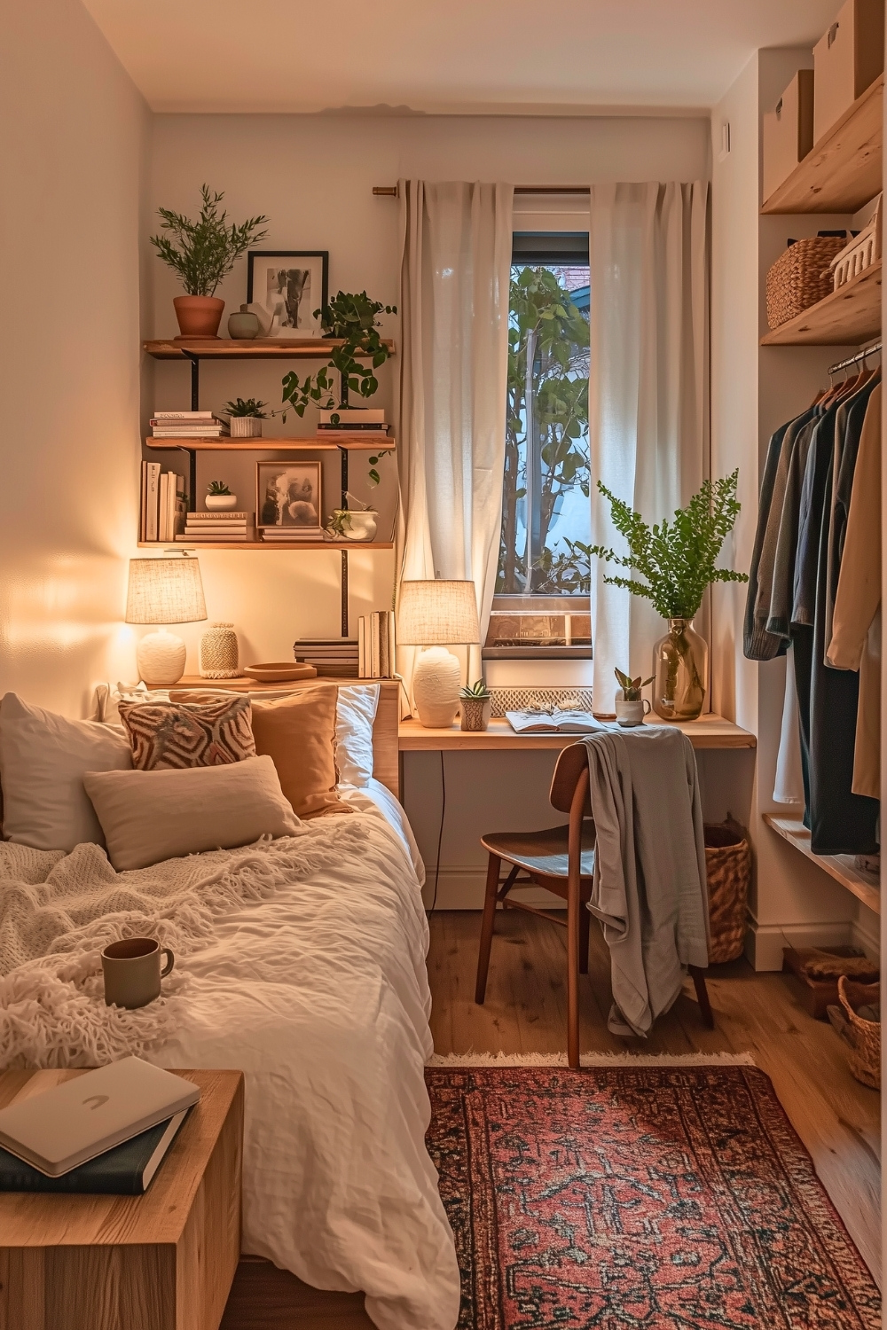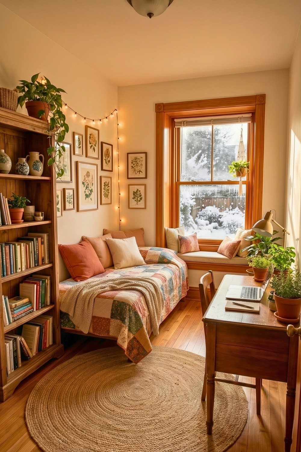 What stands out to me in this room is how easily a tiny bedroom can double as a relaxing winter workspace without losing its cozy atmosphere. The compact bed, simple desk, books, and plants create a balanced layout that works especially well for a student, renter, or small condo setup. I’d happily spend snowy afternoons here, switching between reading and working while natural light softens the space.
