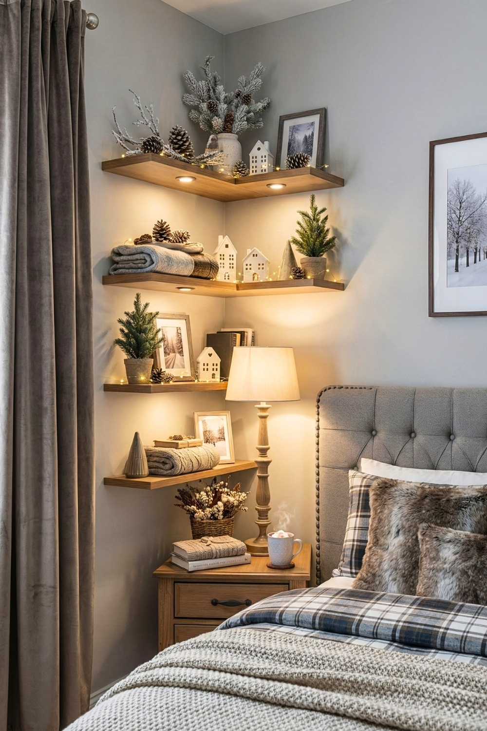 I love how this bedroom uses floating shelves to solve both storage and atmosphere in one move. Soft lighting, neutral colors, and carefully placed decor keep the room warm and inviting while freeing up valuable floor space. This kind of wall-focused design always feels like a smart choice for small winter bedrooms that need to stay light and uncluttered.