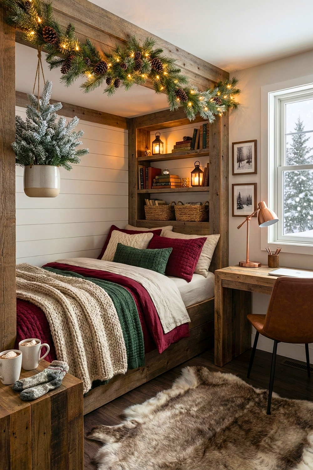 Seasonal decor often overwhelms small rooms, yet this bedroom shows how winter greenery and soft lights can enhance coziness without adding clutter. Keeping the color palette simple allows the festive elements to blend into the space instead of dominating it. I really enjoy how this room feels cheerful and calming at the same time, which is exactly what I look for during long winter months.