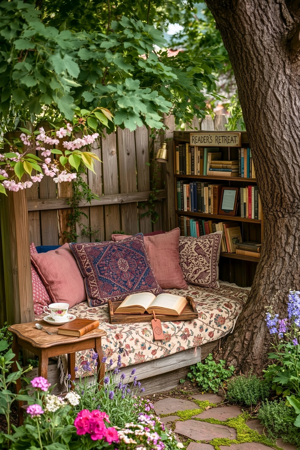 This retreat tucked under pink blossoms and a sturdy old tree feels like a page from a classic storybook. It captures that lovely English cottage charm perfectly, blending a rustic bookshelf right into the garden fence for a seamless look. You could spend hours here with a warm cup of tea and the soft scent of fresh flowers.