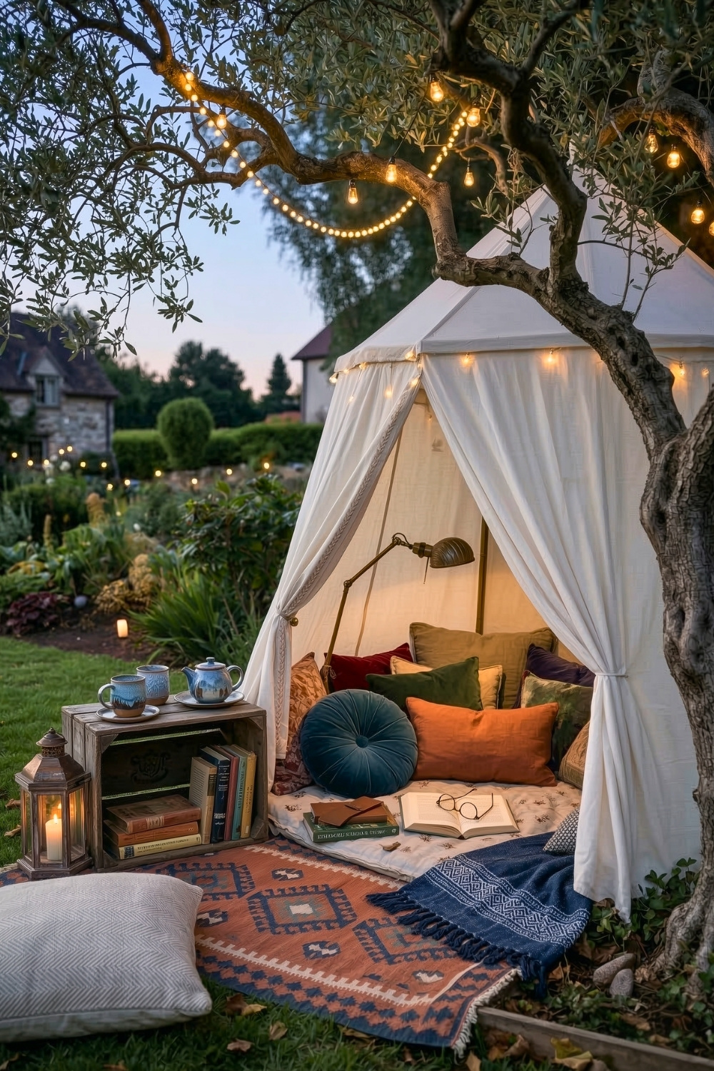 Setting up a canvas tent creates an enchanted atmosphere that feels worlds away from the daily grind. Twinkling string lights and a pile of plush pillows turn this small patch of grass into a magical outdoor escape. My favorite detail has to be the vintage crate used as a tiny library right at the entrance of the tent.