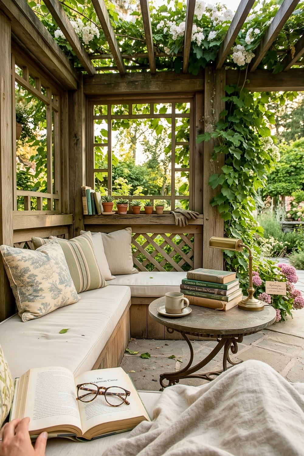 A wooden pergola draped in white vines offers a more structured, zen approach to your patio reading time. The L-shaped bench provides plenty of room to stretch out, while a brass lamp makes it easy to keep reading as the sun goes down. This small nook proves you can have a sophisticated retreat without needing a massive amount of space.
