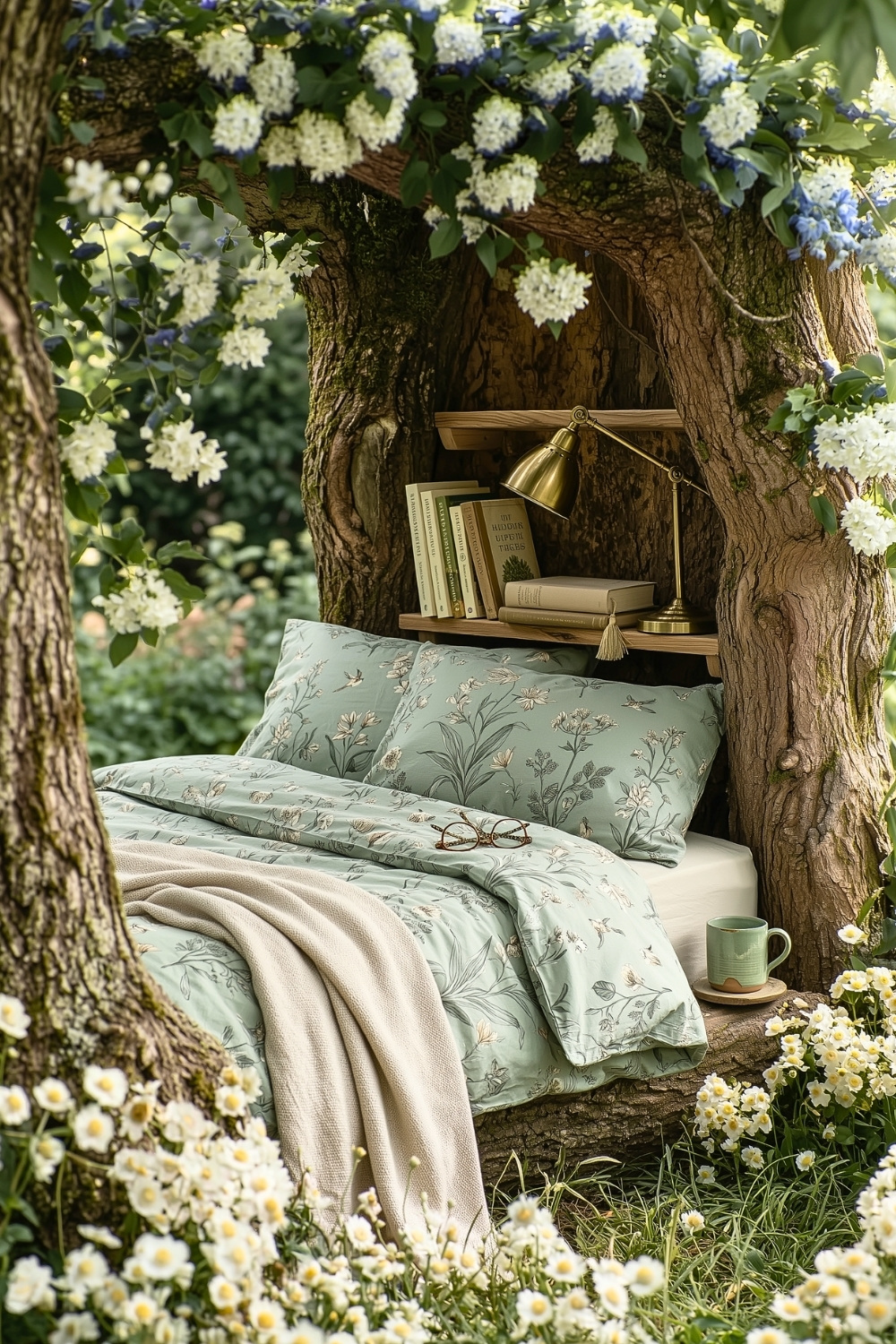 For those who want to take their afternoon relaxation even further, spending a morning surrounded by white blossoms in this cottage-style garden bed feels like a fairytale dream. I find the built-in wooden shelf perfect for keeping my glasses and mug safe while I drift between chapters. You could easily stay here all day soaking in the English garden atmosphere.