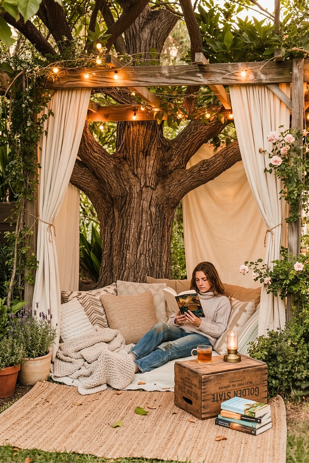 Sometimes a simpler, grounded approach is best, and layers of blankets and floor cushions create a peaceful DIY nook beneath the heavy limbs of an old tree. I love how the simple white curtains and string lights provide just enough privacy for a long, uninterrupted reading session. This setup shows that you don’t need fancy furniture to build a beautiful backyard escape.