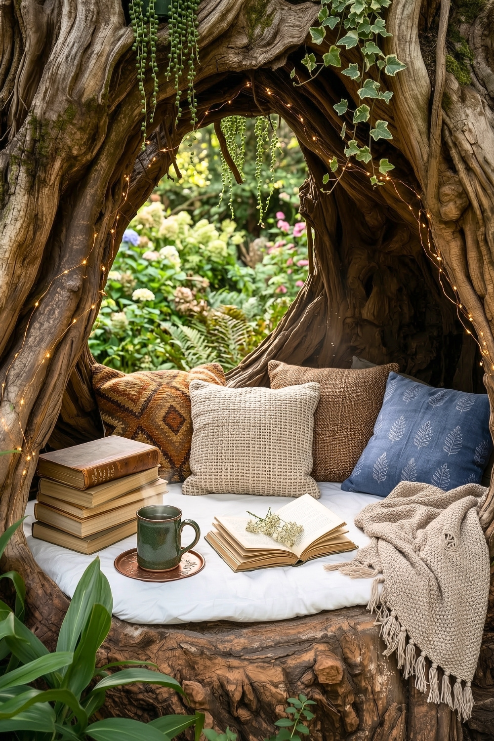 Imagine crawling into a living tree to read by the soft glow of fairy lights and a warm cup of tea. This hollowed-out trunk feels like a secret portal to an enchanted storybook theme where time just stands still. It is the ultimate hidden nook for anyone who wants to fully disappear into nature for an afternoon.