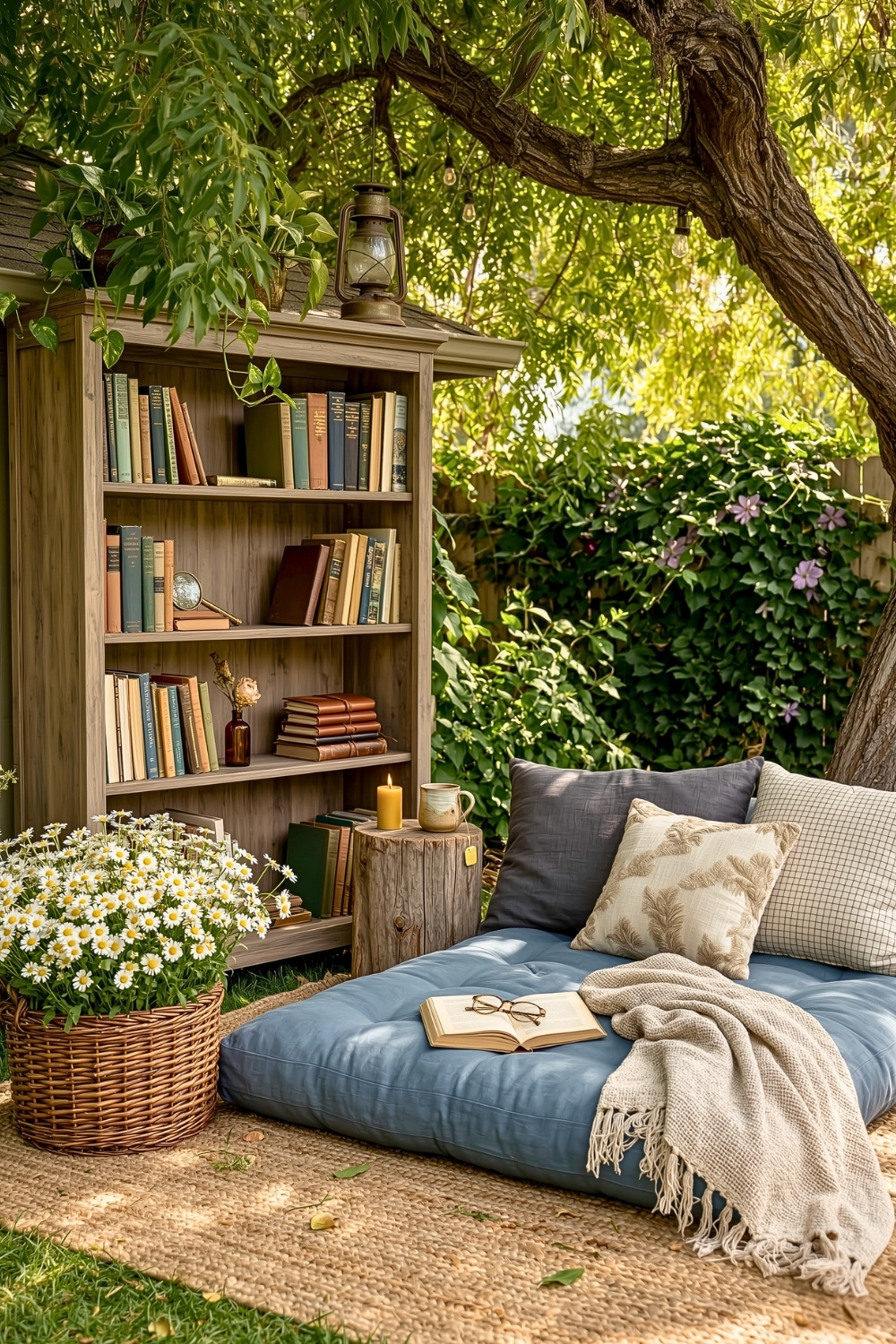 This setup shows how a simple blue floor mattress and a sturdy jute rug can turn any patch of grass into a relaxed backyard haven. A tall, rustic bookshelf keeps your favorites within arm’s reach while you lounge in the shade of a wide-reaching tree. Daisies in a wicker basket add just the right touch of sunshine to this easy DIY project.