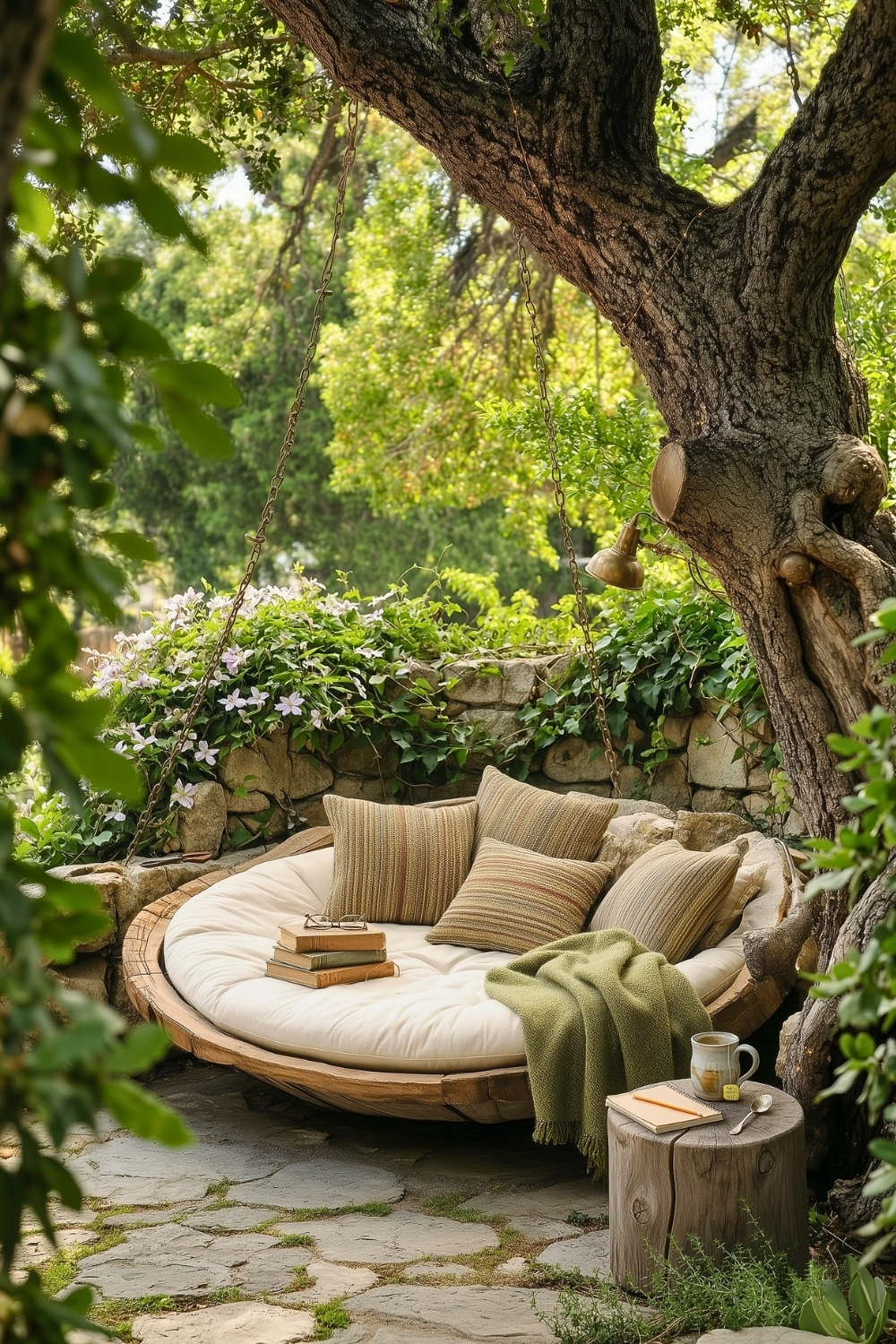 This dreamy hanging daybed setup tucked under vines and string lights is the ultimate outdoor reading nook idea. The rustic wooden frame, soft neutral cushions, and glowing wall of lights create a magical backyard escape that’s both cozy and inviting. It feels like a secret cottage corner for relaxing, napping, or escaping into your favorite book on a summer night.