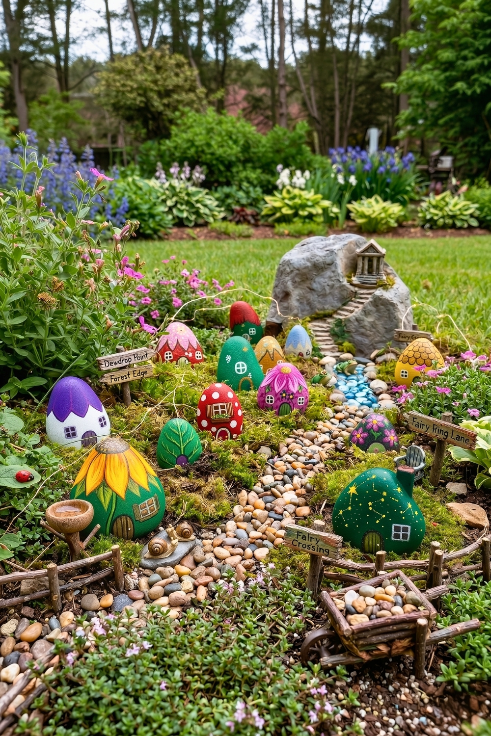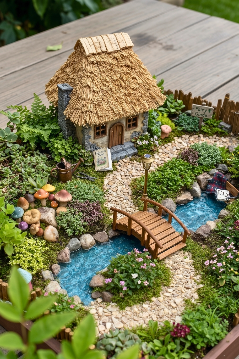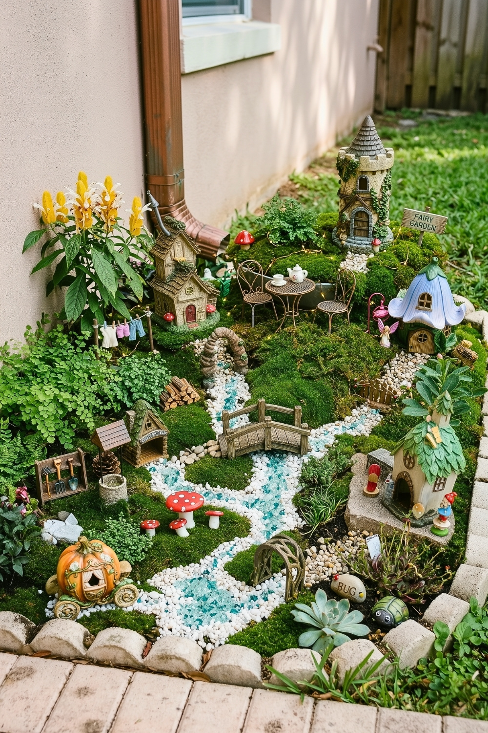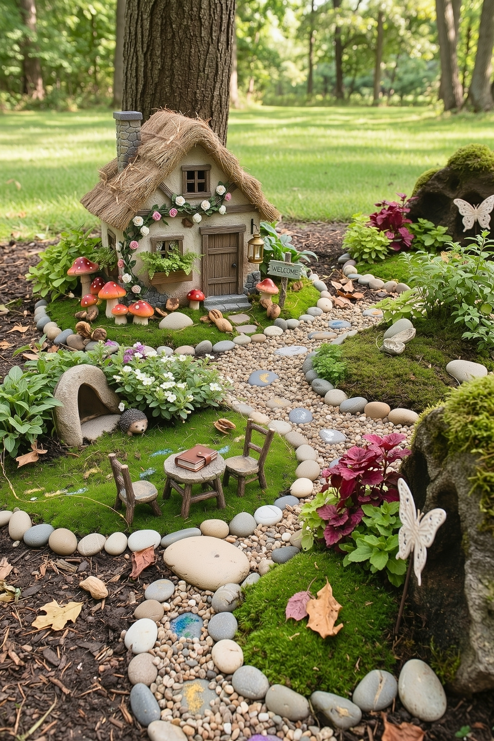 Winding paths of garden stones leading to a charming thatched cottage create a welcoming feel for any front yard. My favorite part is setting up a small sitting area with miniature furniture to make the scene look lived-in and ready for guests. This design shows how simple accessories can turn a small patch of earth into an enchanted wonderland.