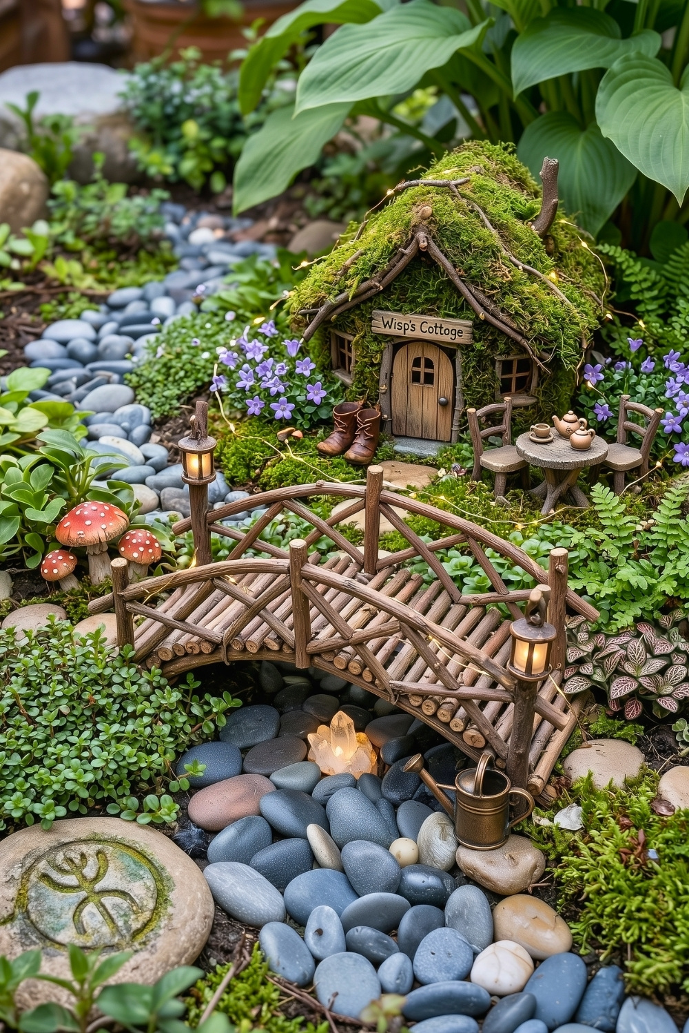 Intricate accessories like rustic twig bridges and weathered cottages help ground a design within an enchanted forest theme. Placing these miniature furniture pieces among thick moss and shade-loving plants lets me build a cozy garden scene that feels like a quiet, magical sanctuary.