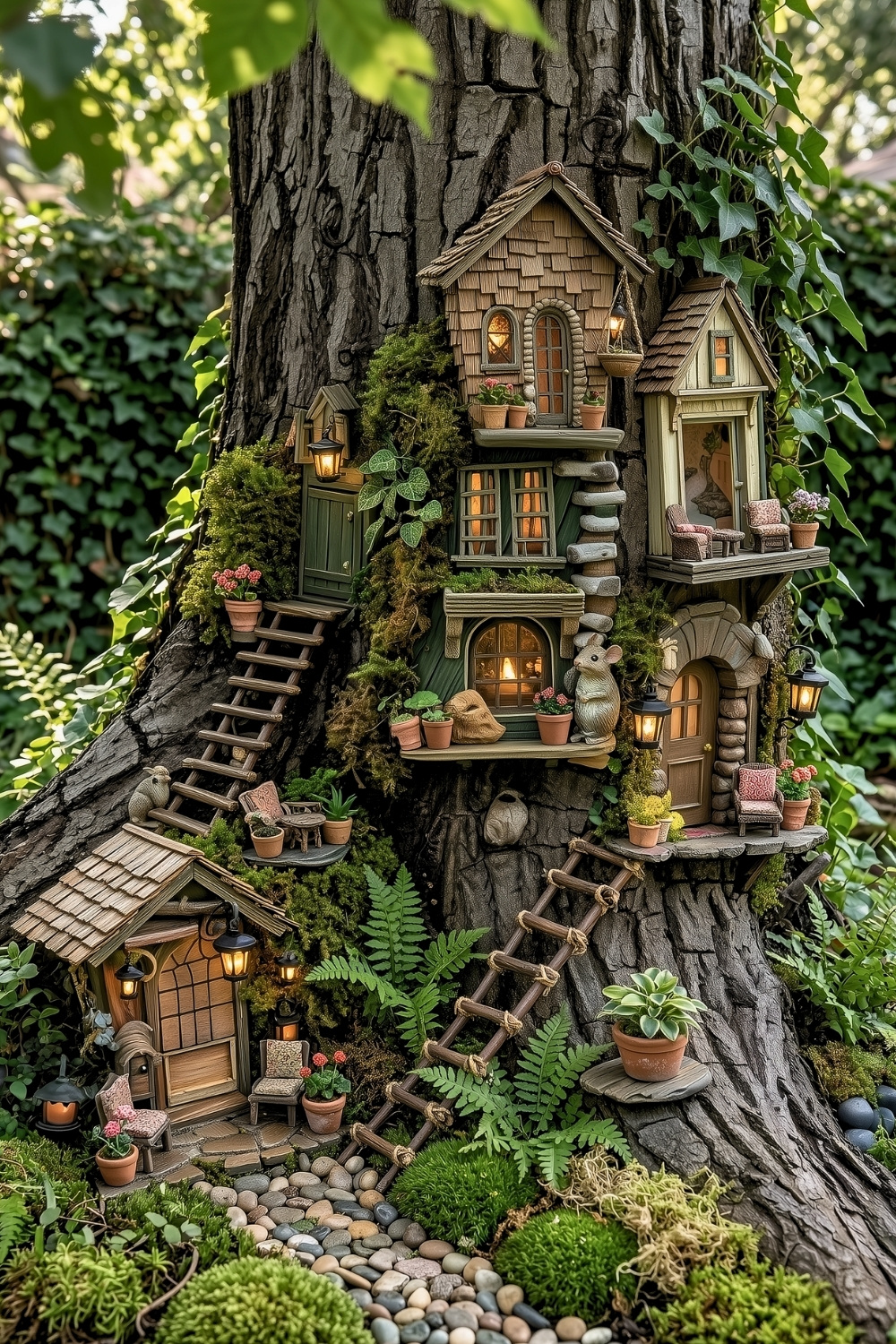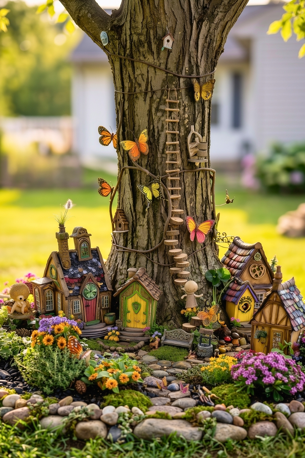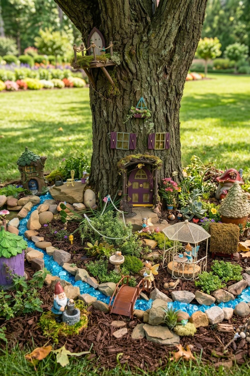 Adding miniature furniture, like tiny benches and tables, makes the scene even more enchanting. These small touches make the area around the tree come alive, turning it into a charming fairy village that sparks the imagination.