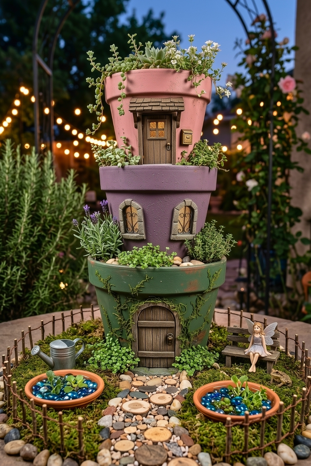 Stacked fairy garden pots function like a vertical apartment complex, making them ideal for adding a miniature world to a compact porch or patio. I enjoy nesting tiny fairy doors into the soil of each level and surrounding them with spilling plants to give this DIY project a lush, high-rise feel.