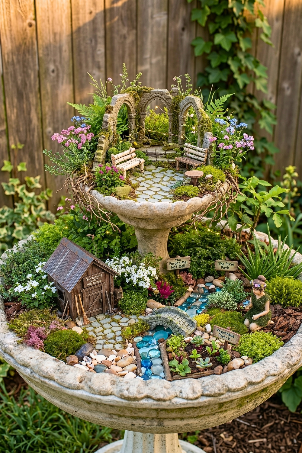 Repurposing tiered birdbath containers into multi-level garden planters adds incredible depth to any mini fairy garden. Mixing hardy succulents with tiny stone ruins helps me create a weathered, magical garden design that feels like an ancient discovery nestled right in my outdoor space.