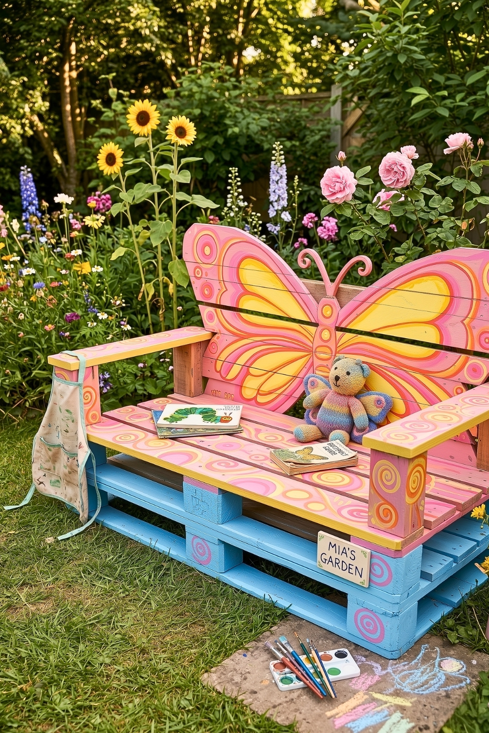 I’m also a huge fan of combining bench seating with artistic flair, especially when it encourages kids to sit and enjoy nature. Functional furniture meets beautiful art in this butterfly-shaped seat, making it one of the most high-impact patio ideas for families. Your garden will feel much more inviting for toddlers who need a comfortable place to rest after running around the backyard.