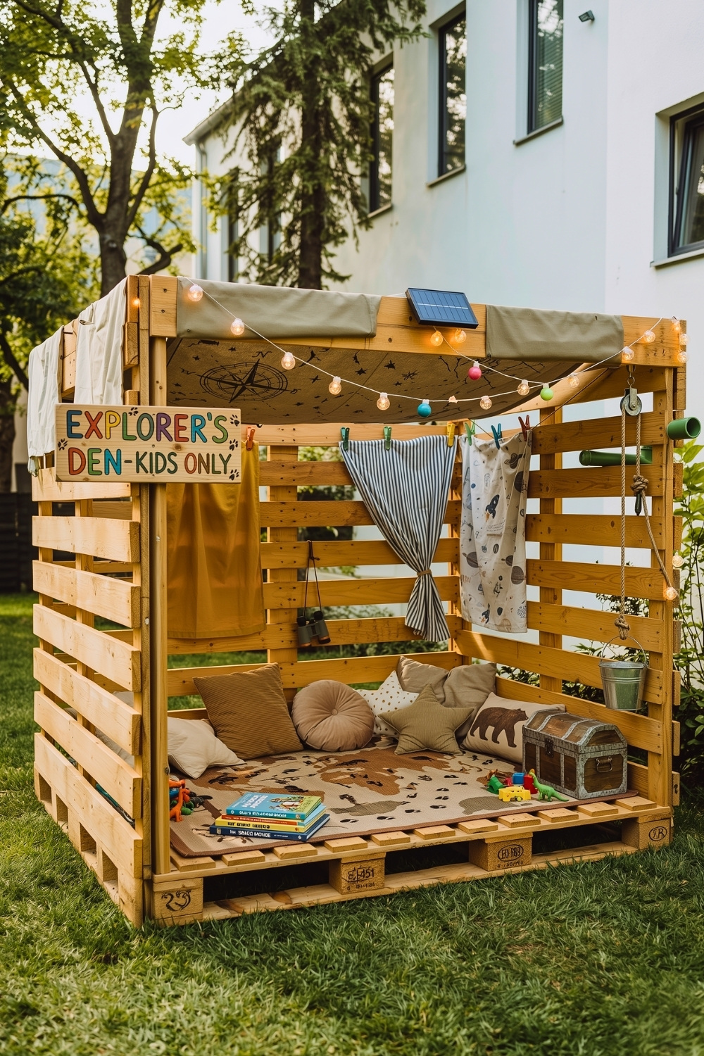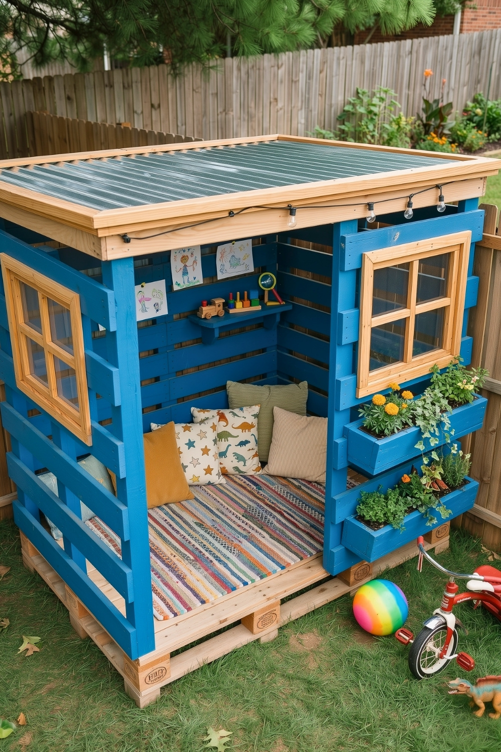 I also love how this vibrant blue play house doubles as a cozy reading nook and a mini plants and herb garden. Adding built-in flower boxes to the exterior is a genius way to let kids practice gardening while keeping the main backyard area tidy. A combination of sturdy pallet walls and a soft interior rug creates the perfect “secret” hideout for long summer afternoons.