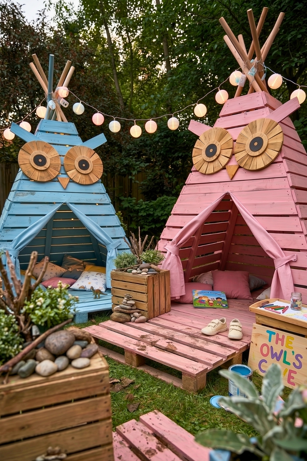 Building a cozy nook doesn’t have to be expensive, and these owl-themed play houses perfectly demonstrate garden DIY at its best. I find that beginners can easily manage the A-frame design, which offers a shaded spot for reading or resting during a long afternoon outside. These charming structures instantly turn a quiet corner of the garden into a magical woodland retreat that children will cherish.