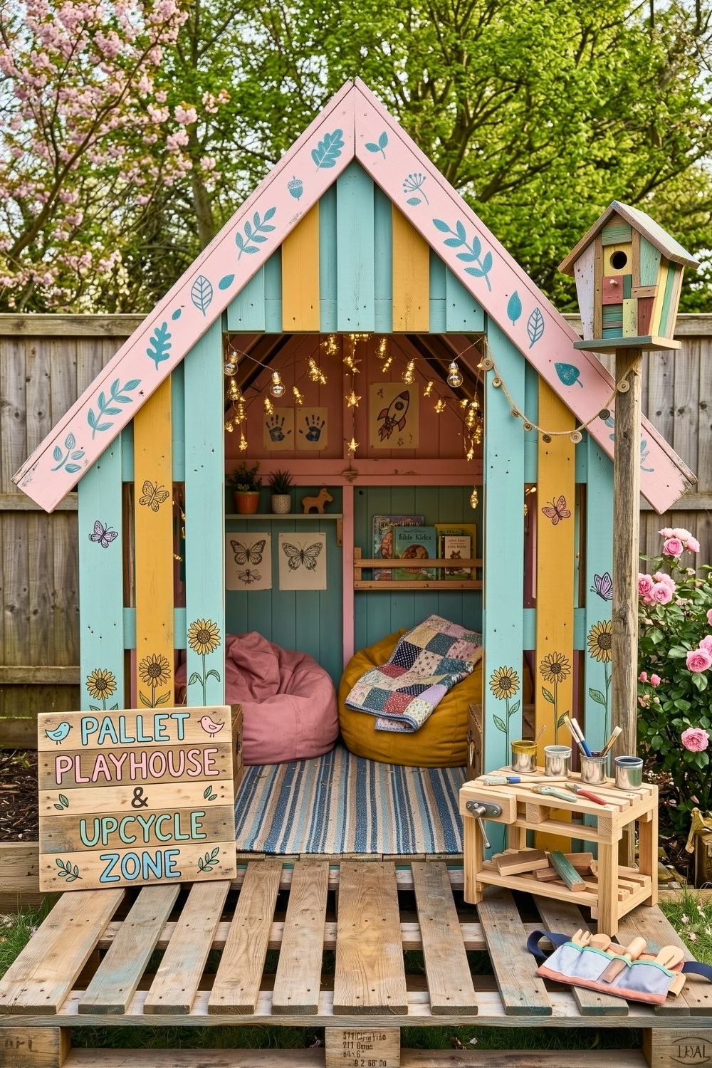 Next, I really wanted to showcase how a few leftover boards can become a creative “Upcycle Zone” where kids can get messy with paint and crafts. The inclusion of a small workbench and a cozy reading nook inside these play houses ensures that this setup stays functional through every season. I find that using bright, pastel colors and cute signs makes the whole area feel inviting, proving that easy garden DIY projects can be both stylish and incredibly fun for the little ones.