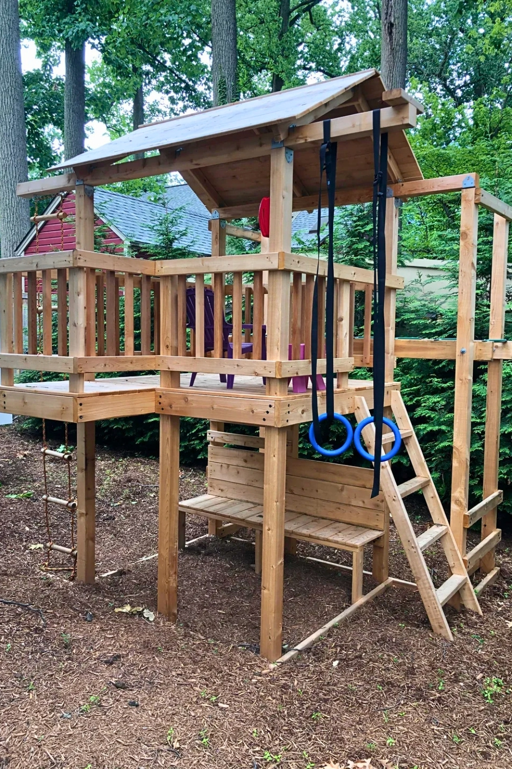 Another detail I really appreciate in u/iroosma’s design is how the climbing features make the structure feel like a mini adventure park. Gym rings, sturdy steps, and an elevated deck encourage active play while keeping the overall footprint compact enough for small backyards. When I see outdoor buildings designed like this, I always think they strike the perfect balance between creative play houses and practical garden patio ideas for families.