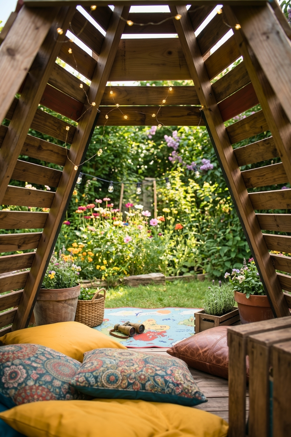 Since small backyards often lack a private retreat for children, an A-frame reading nook is an ideal addition that maximizes vertical space. Natural light filters through the wooden slats to create a bright, airy atmosphere that feels spacious despite the small footprint. I find that an easy garden DIY project like this offers a high-end look for families working with a limited budget.