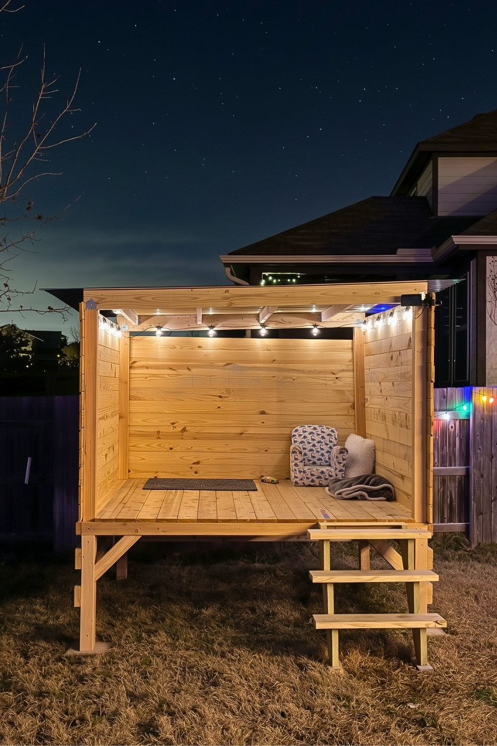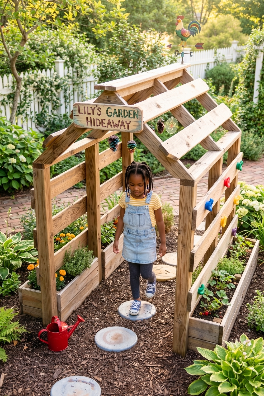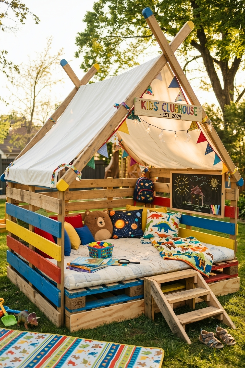 Finally, I’m convinced this daybed clubhouse is a total winner for any garden because it truly grows with your family. Including simple wooden steps makes the space accessible for toddlers, while the chalkboard wall keeps older kids entertained for hours. You essentially get a hybrid of outdoor furniture and a fort that provides a comfortable spot to nap or play right in the heart of your patio area.