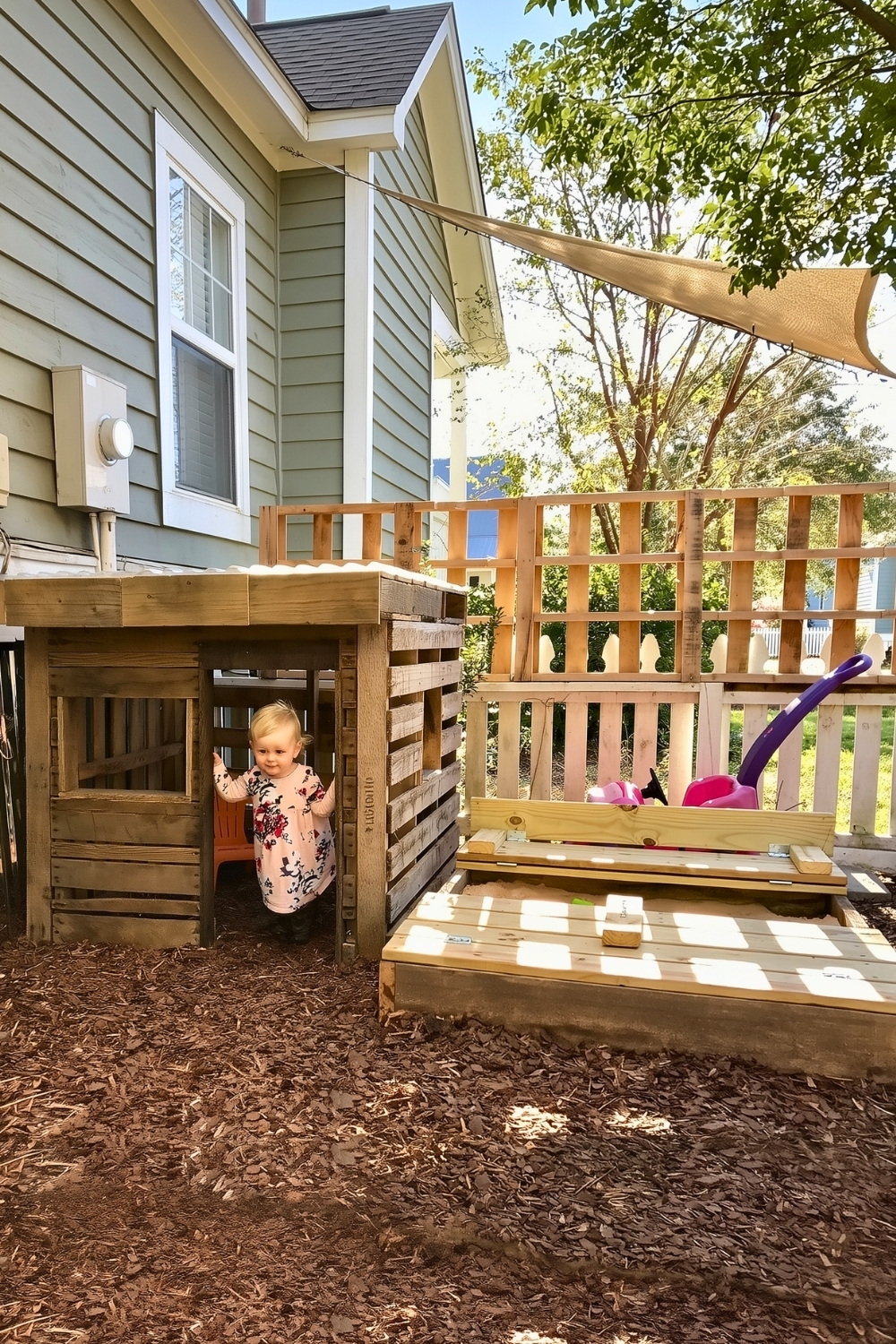 For families who want something more adventurous, a raised playhouse like u/iroosma’s adds an exciting vertical element to outdoor pallet projects for kids. I love how the upper deck, rope ladder, and monkey bars transform a small backyard into an active play area while still leaving room underneath for bench seating or storage. Designs like this solve the classic backyard challenge of limited space by stacking fun features upward instead of spreading them across the garden.