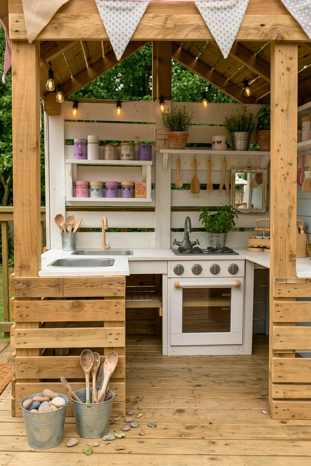 I truly believe every child needs a mud kitchen where they can get as messy as they want without any stress. The natural gaps in the wood offer perfect shelving for jars of “potions” and wooden utensils. Building one of these outdoor buildings is actually quite easy for beginners because the pallets provide a ready-made frame that just needs a bit of imagination to come to life.