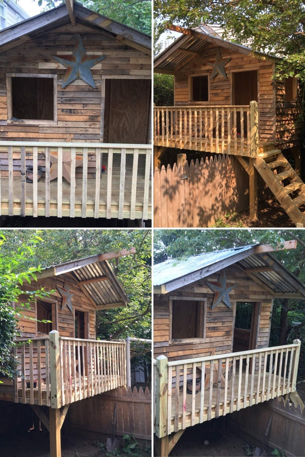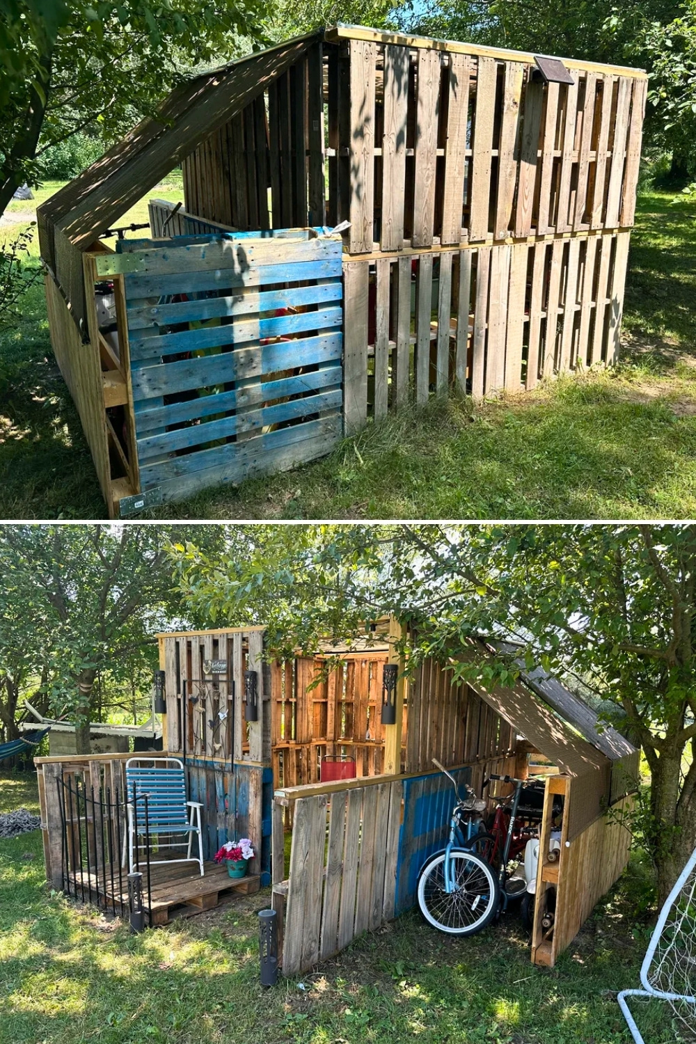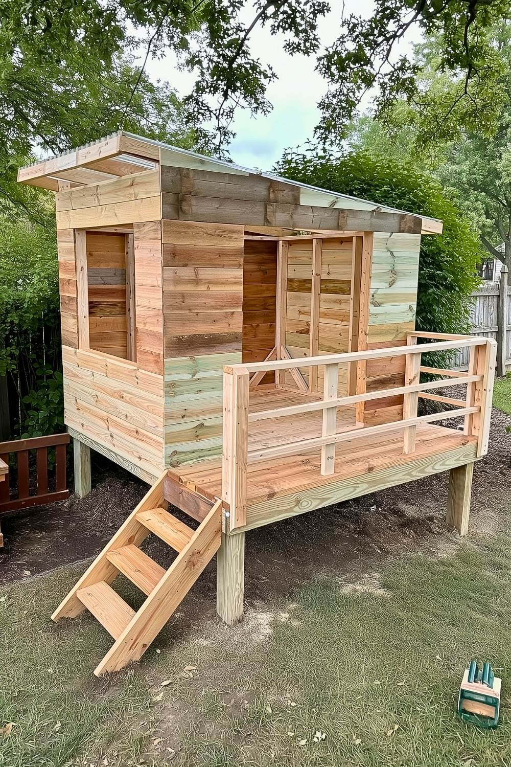 Rustic pallet wood can also bring a warm cabin-style charm to the backyard, and u/smitzilla-’s raised treehouse-inspired play house is a perfect example. The front porch and reclaimed boards create a cozy little hideaway that feels more like a woodland shed than a typical kids structure. I love how projects like this turn simple wood crafts into beautiful outdoor buildings that kids can enjoy for years.