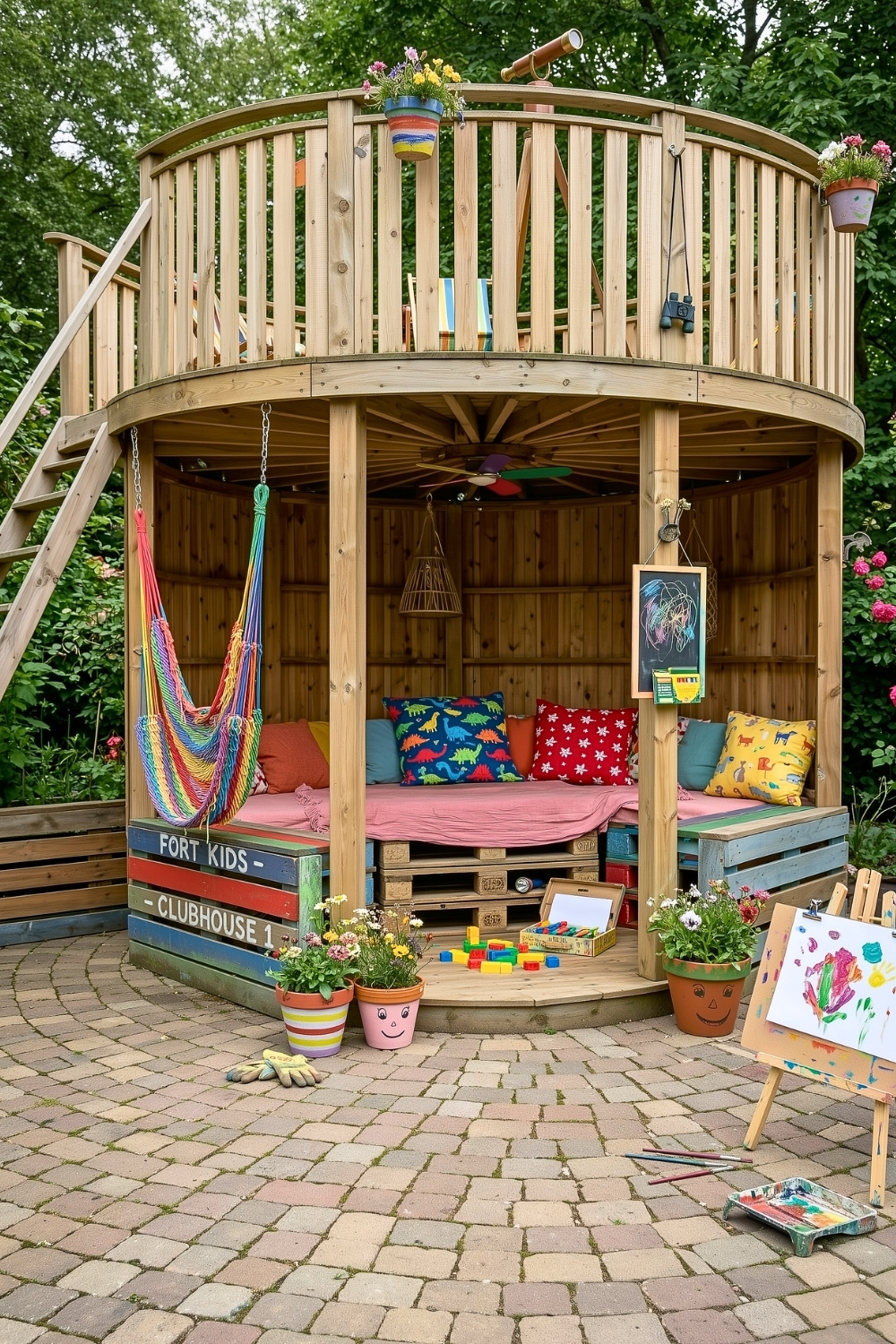 I honestly think this circular lookout is the ultimate backyard dream for any kid with a big imagination. By utilizing a round design and adding a second level for stargazing, I’ve managed to turn basic wood into a full-blown adventure hub that fits perfectly into a smaller garden corner. The lower level stays cozy with plenty of pillows and a hammock, providing a shaded spot that solves the common struggle of keeping kids cool and entertained while they enjoy their outdoor pallet projects all afternoon.