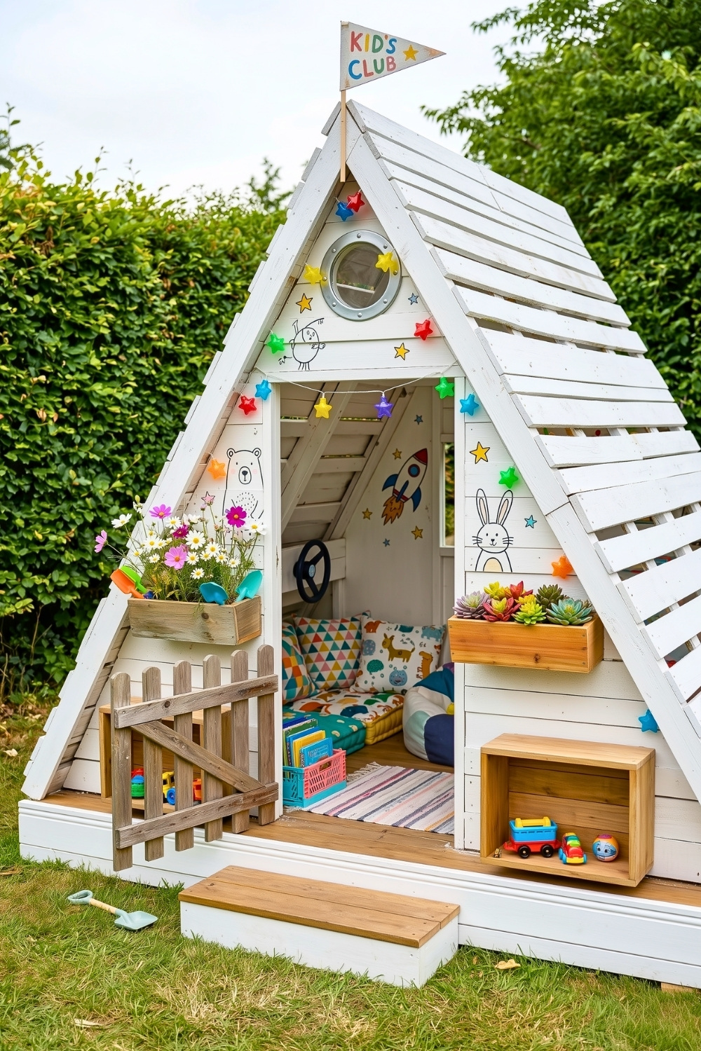I’m totally obsessed with how clean and modern this white A-frame play house looks against the greenery of a typical backyard. By adding flower boxes and built-in shelving, I’ve created a space that isn’t just for play but actually helps keep outdoor toys organized and off the grass. It’s the perfect solution for parents who want a dedicated “kids club” area that actually enhances the overall look of their patio ideas rather than cluttering them up.