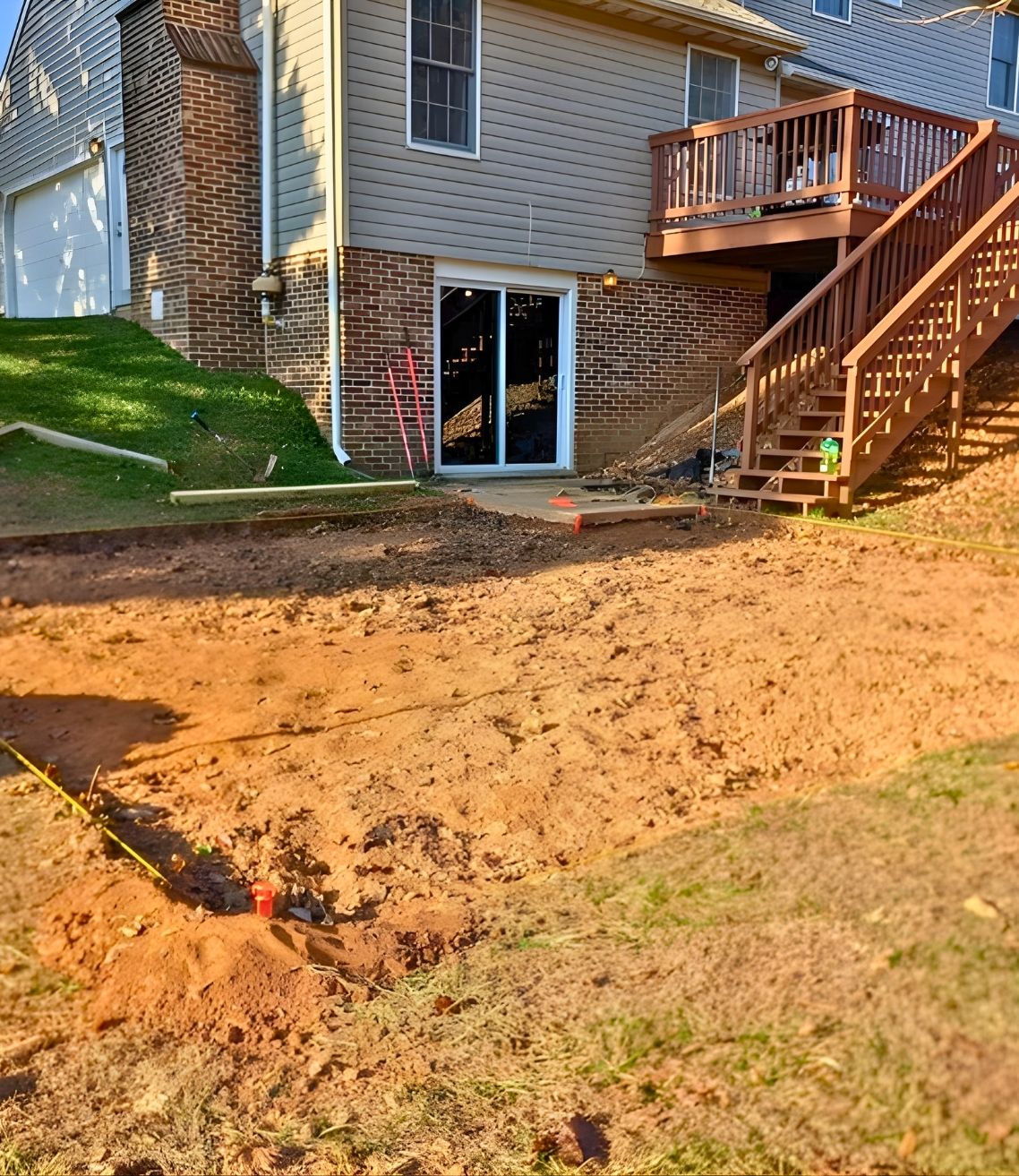 He really shows us the unglamorous part of patio building: digging and grading. A large section of the yard was excavated to create a level base, especially important on a sloped backyard like this. You can see the rough outline of the future patio staked out while the soil is cut down and leveled.