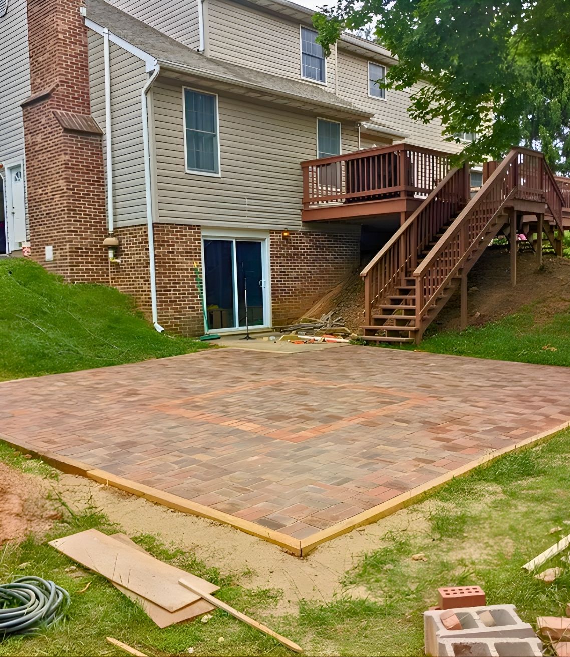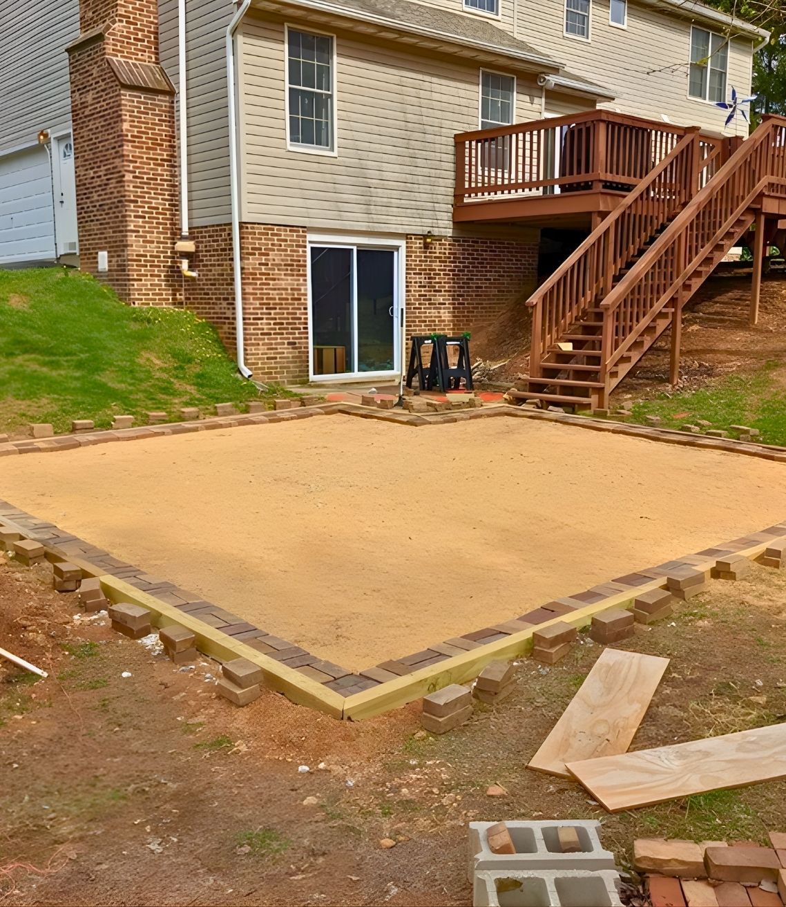 Once the ground was leveled, he framed the patio perimeter with pressure-treated boards and started building the base using compacted sand. The border bricks are already being placed to lock in the shape.