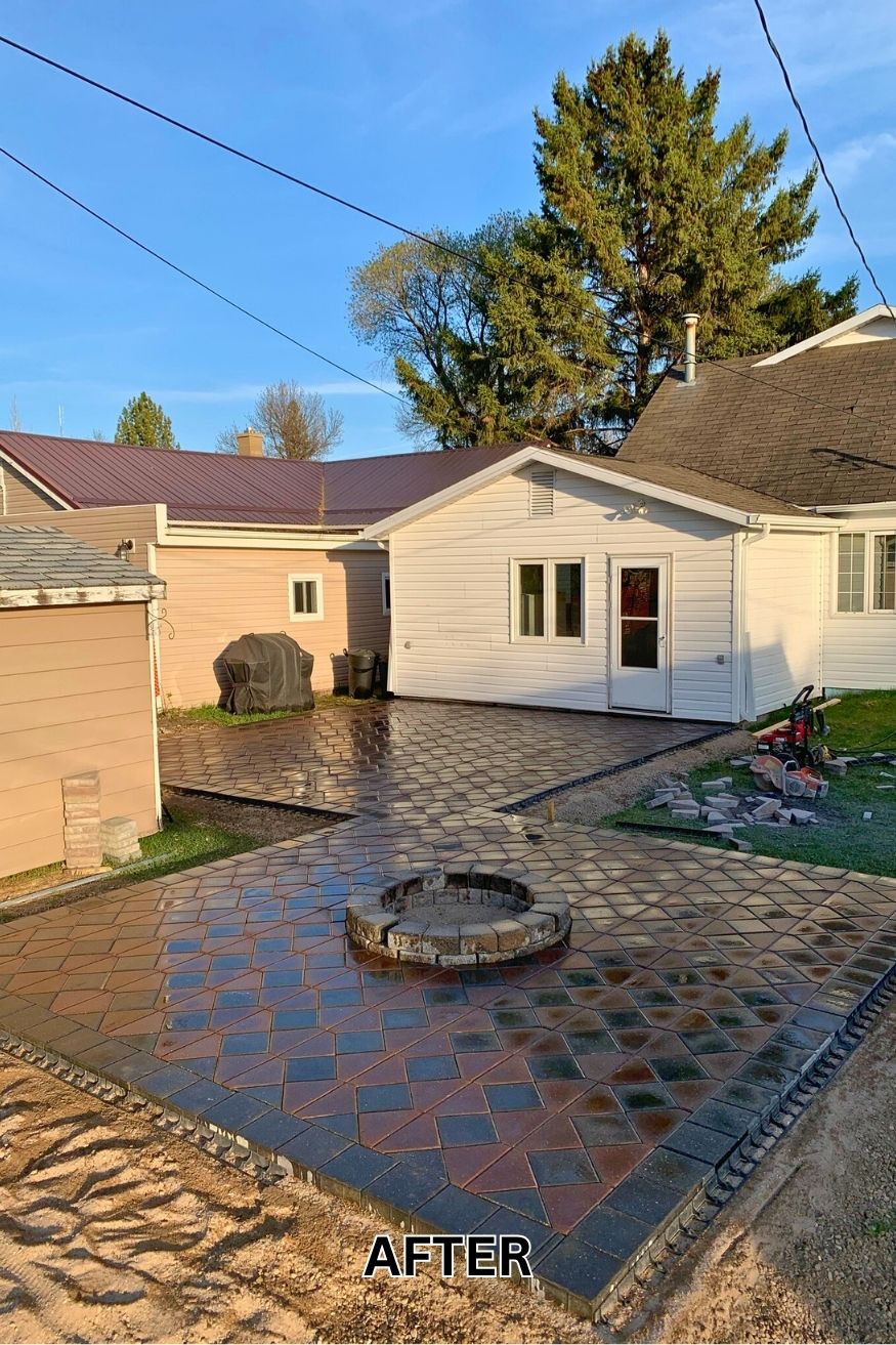 With the base set, the pavers go in quickly, and the whole design suddenly makes sense. The patio uses a subtle color mix with a contrasting square pattern in the center that naturally draws the eye. That small design move gives the space structure without needing expensive materials.