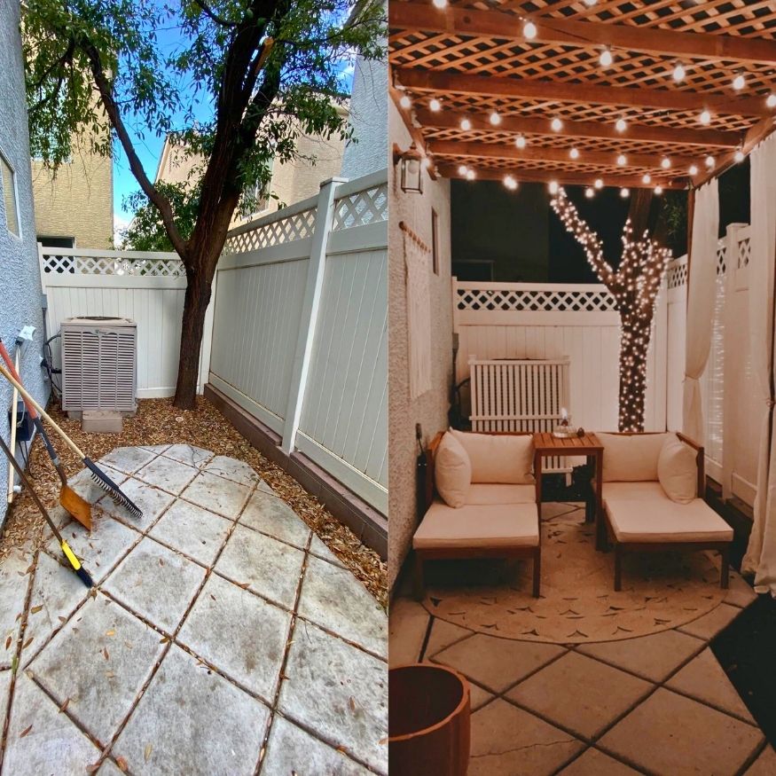 What pulled me into u/mckennabarry’s patio wasn’t just the Mediterranean villa vibe; it’s how a super-narrow Vegas side yard suddenly feels intentional and styled. The pergola with gauzy curtains adds just enough privacy. The AC cover is truly genius. It’s proof that a small footprint doesn’t mean small impact, just smarter placement, breathable materials, and a few design risks that actually paid off.