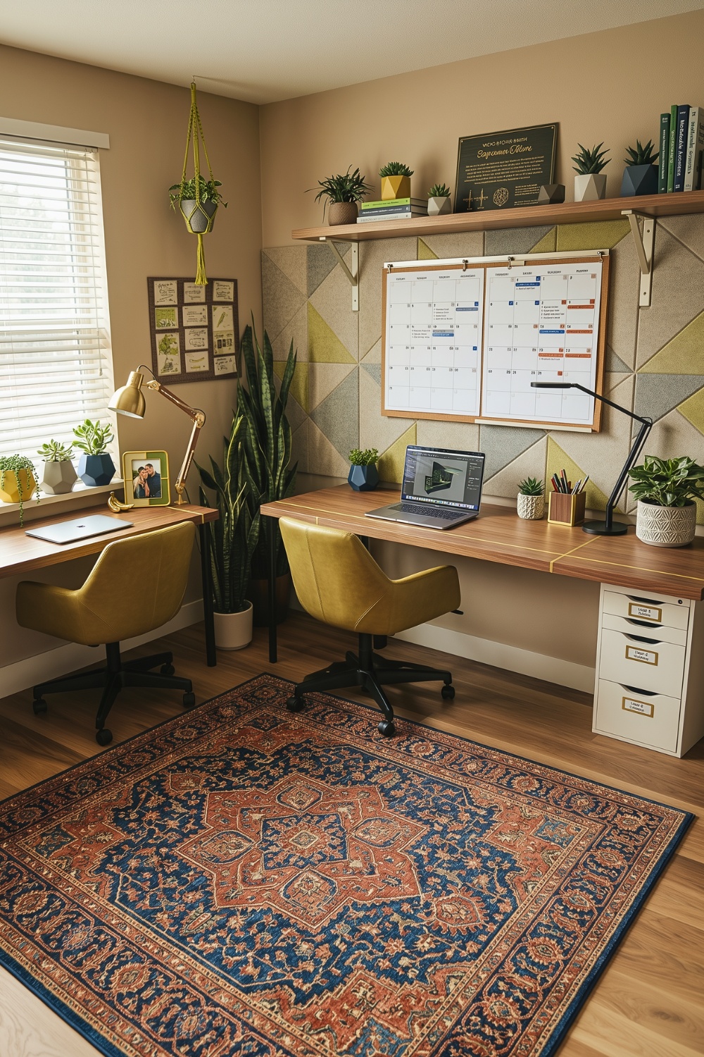 Sometimes a splash of color is all it takes to boost productivity, and I think these yellow chairs are the perfect bold choice for a shared corner. The geometric wall treatment adds plenty of visual interest to the modern setup, while the oversized calendar helps two people stay on the same page. It’s a creative way to turn a standard room into a high-energy space that feels personal to both users.